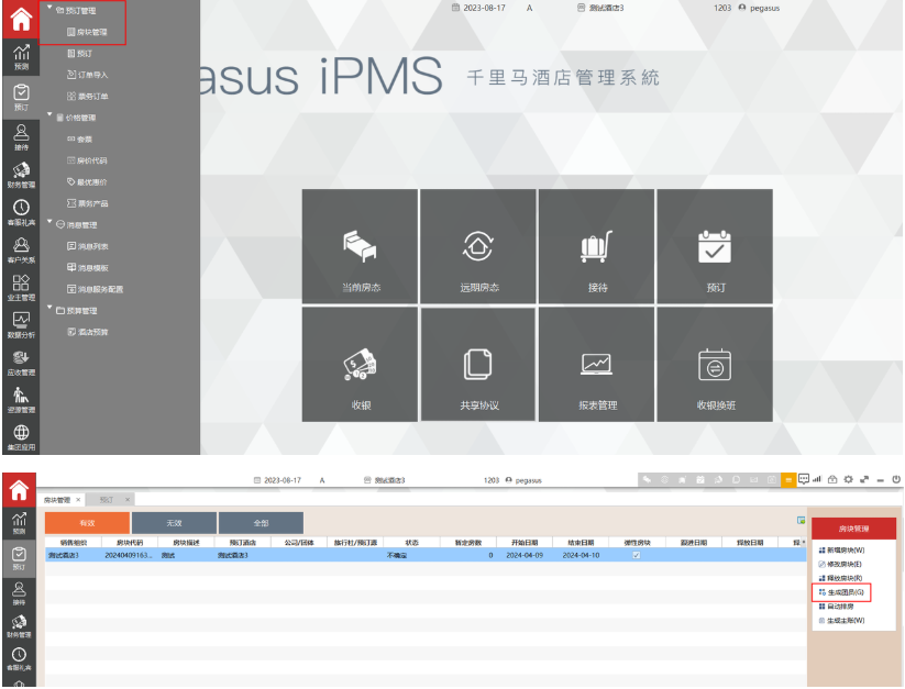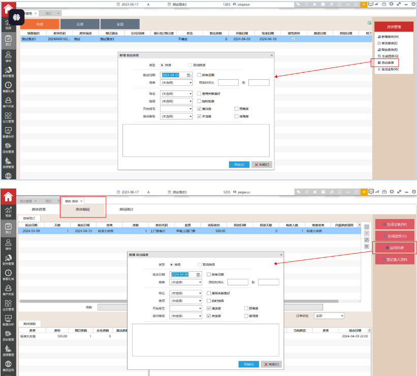 自动排房:选择“预订管理>房块管理>自动排房”或点击“修改房块>房块期间>自动排房”来实现。
