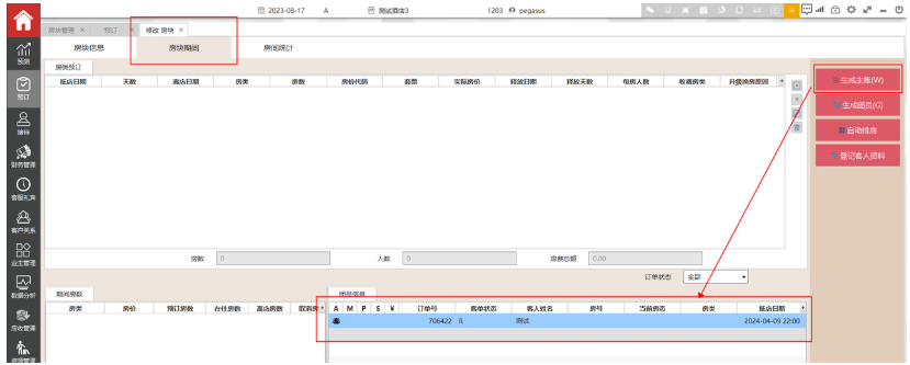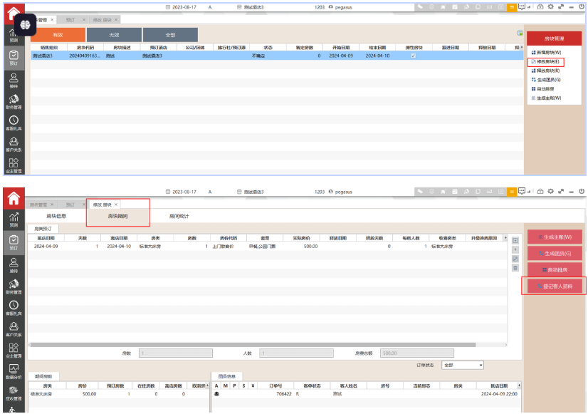 登记客人资料:点击“修改房块>房块期间>登记客人资料”来实现。