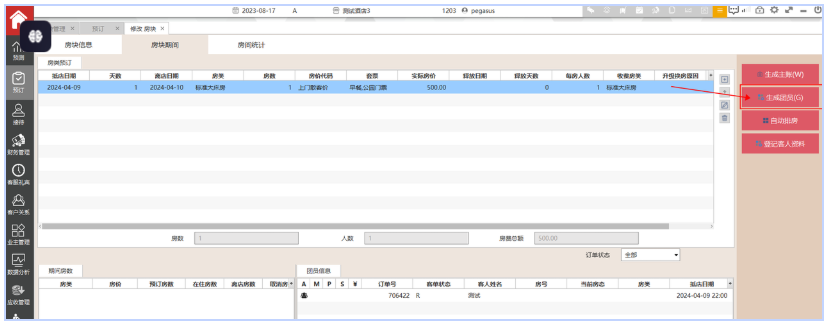 生成团员:选择“预订管理>房块管理>生成团员”或点击“修改房块>房块期间>生成团员”来实现。