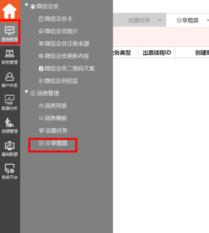 1、登陆组织单元,选择—“营销管理”-“分享票券”
