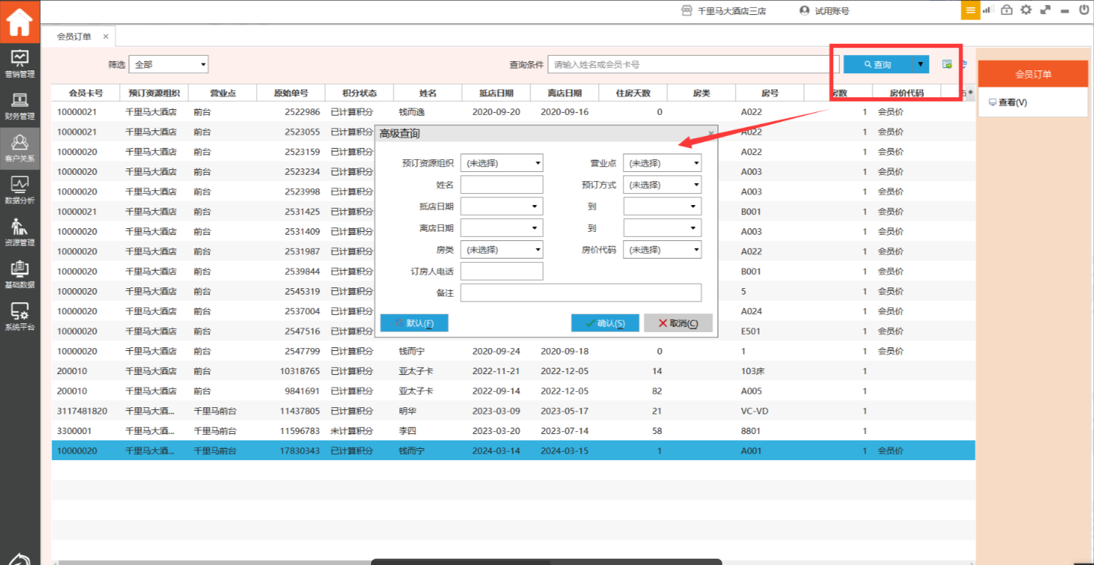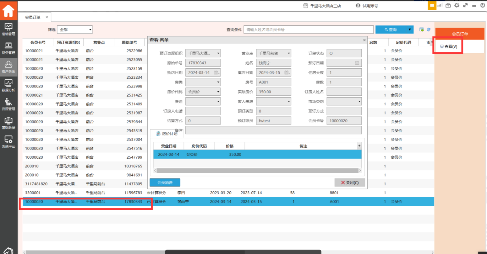 会员订单会显示会员消费的记录,选中记录后双击或点击右侧查看可以查看详细的记录。使用右上角查询功能,可以通过设置筛选条件来查询对应的记录