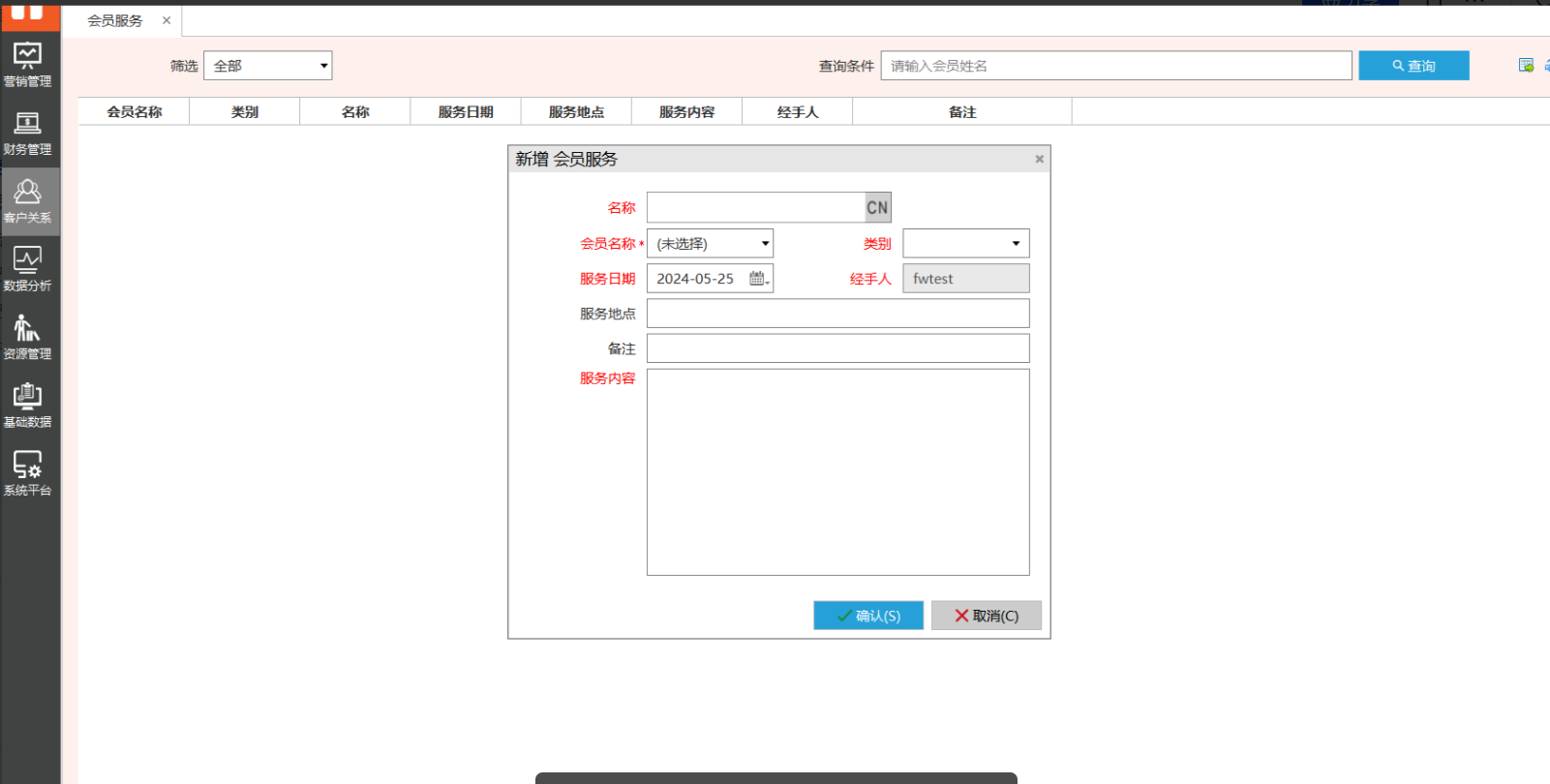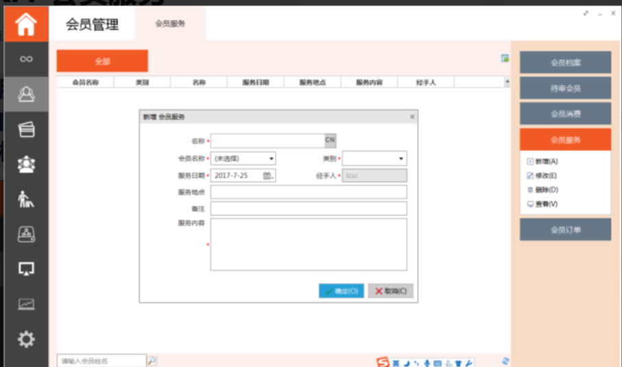 会员服务用于记录这些服务的详情,新增输入时包括内容:*服务项目、*名称、*日期、地点、*内容、*经手人、备注。(*号代表必填字段,下文相同)