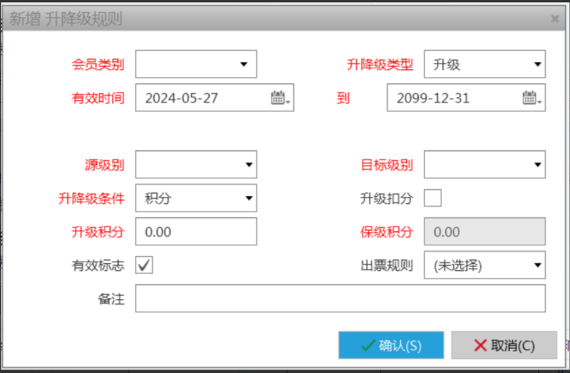 升级业务类似兑换奖品,升级后都需根据升降级的积分设定,在客人的积分余额中扣除分数。会员升降级规则用于定义自动升降级的规则,主要是定义适用的会员类别、会员级别及所需的积分。