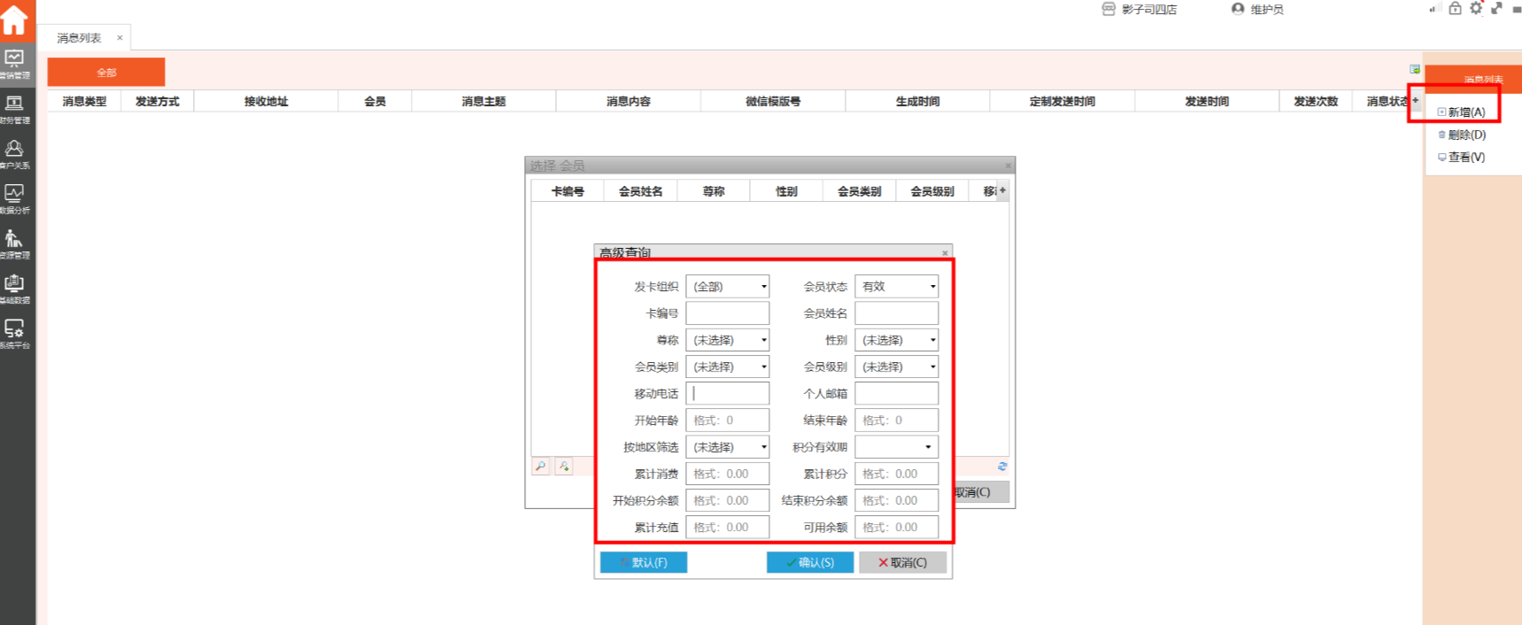 2、选择右侧的“新增”后弹出选择会员界面,输入信息筛选会员后发送即可