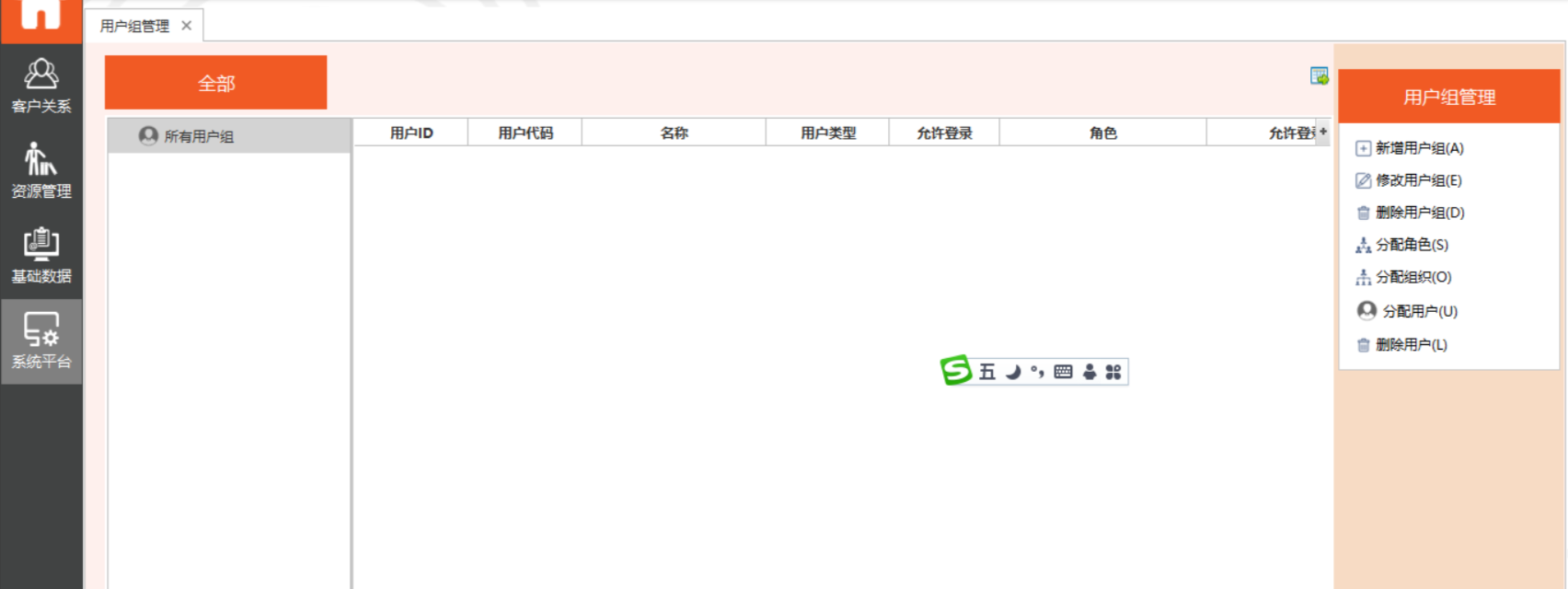 系统平台 -> 用户组管理 -> 新增,输入用户组的“名称”、类型。