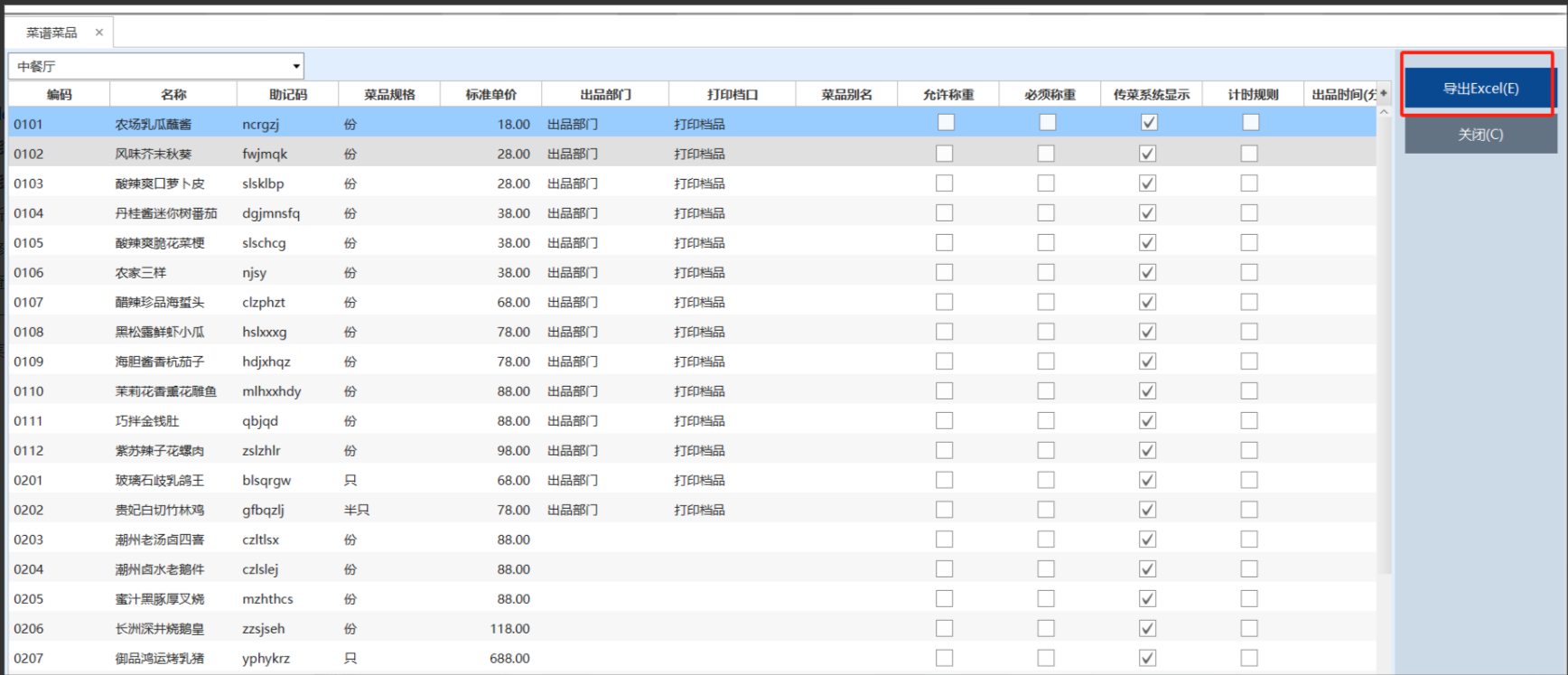 2.5.3 查看菜谱菜品中所有菜品的定价,以及导出excel