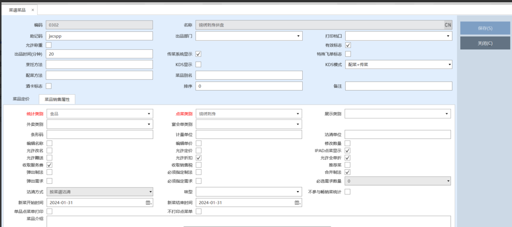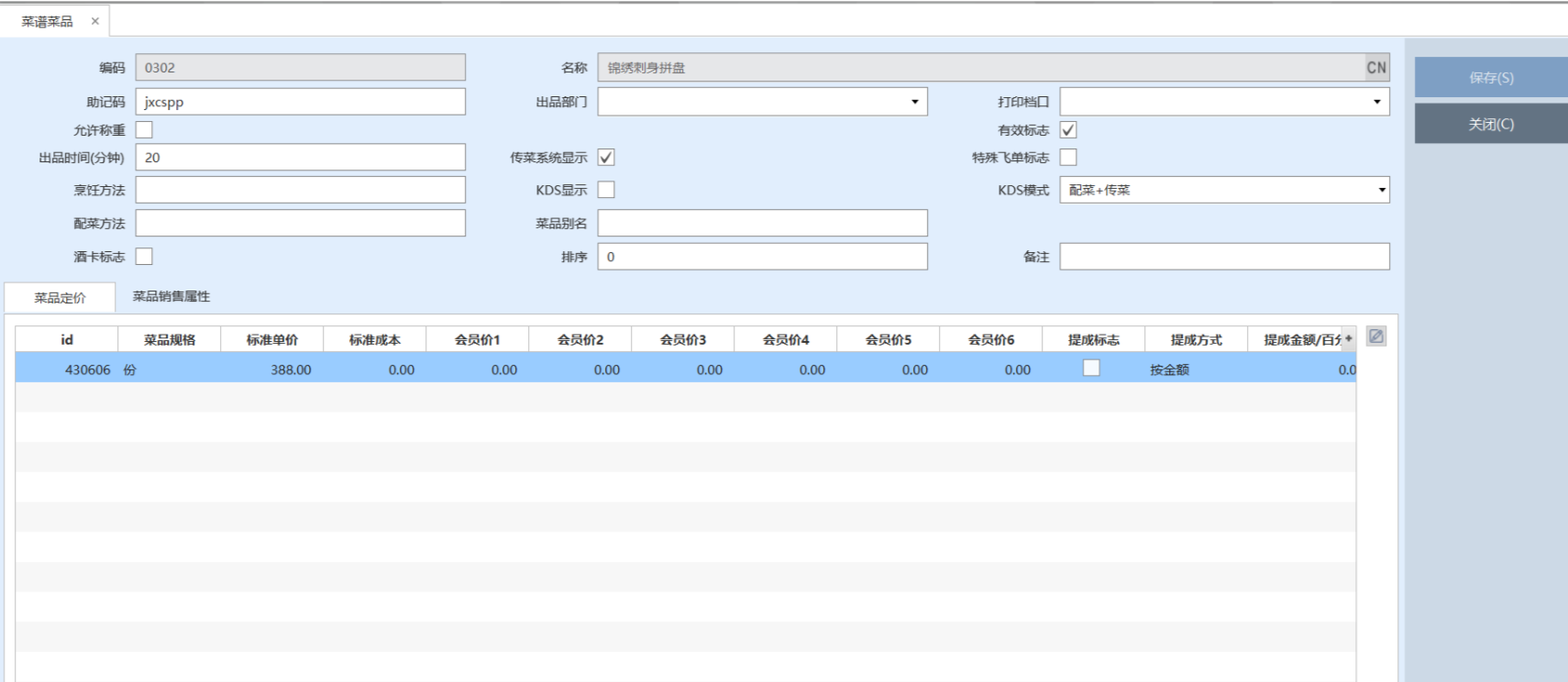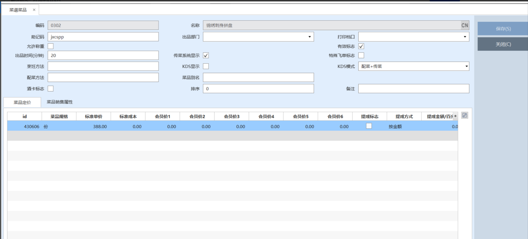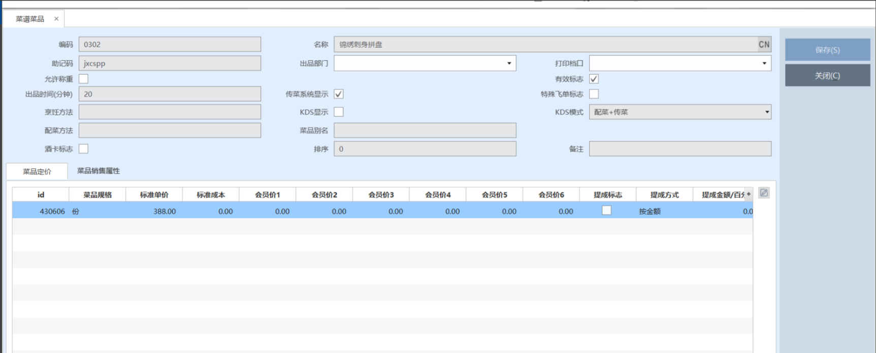 2.2.3 修改菜品的价格或者销售属性后点击"保存"