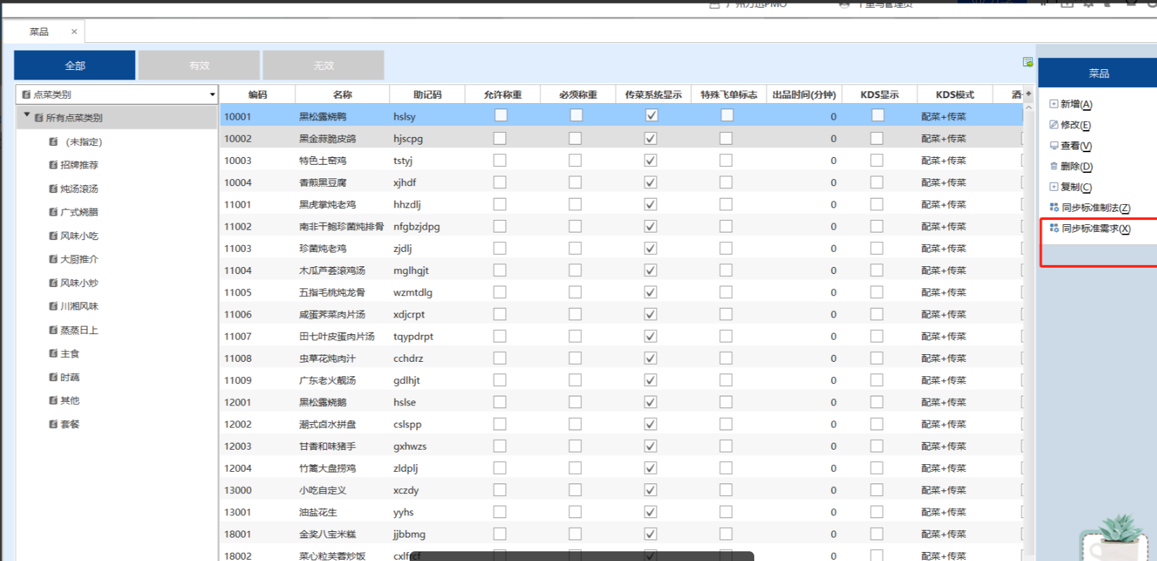 1.3 选择菜品,点击"同步标准需求"