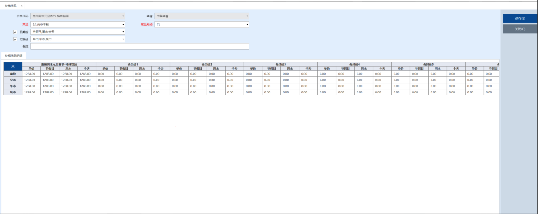 2.2选择左边的价格代码,然后点击右边的新增菜品价格,即可完成菜品的价格设置,在新增界面,选择需要设置的菜品,输入菜品的规格,选择日期,以及市别,然后在对应的框下面输入具体的价格,最后点击保存即可