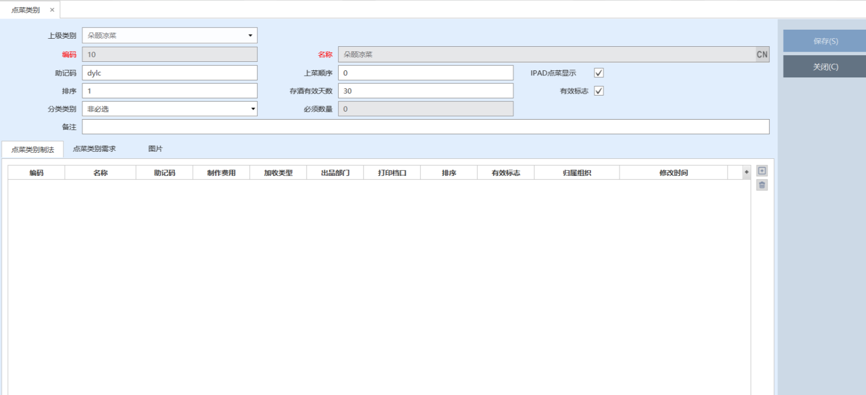 ●iPAD点菜显示:用于设置该类别下的菜品列表在 IPAD 点菜系统是否显示;