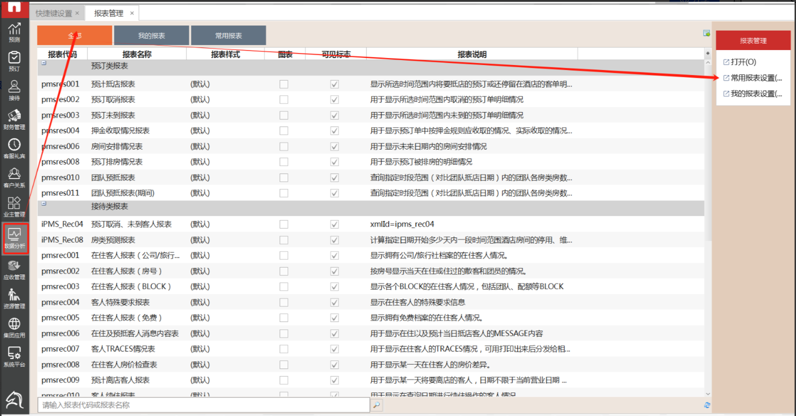 在组织单元中通过“数据分析”--“报表管理”功能选项中,打开对应的报表,选“常用报表设置“勾选对应的报表设置常用的,选“我的报表设置”勾选对应的报表设置成我的,如下图所示