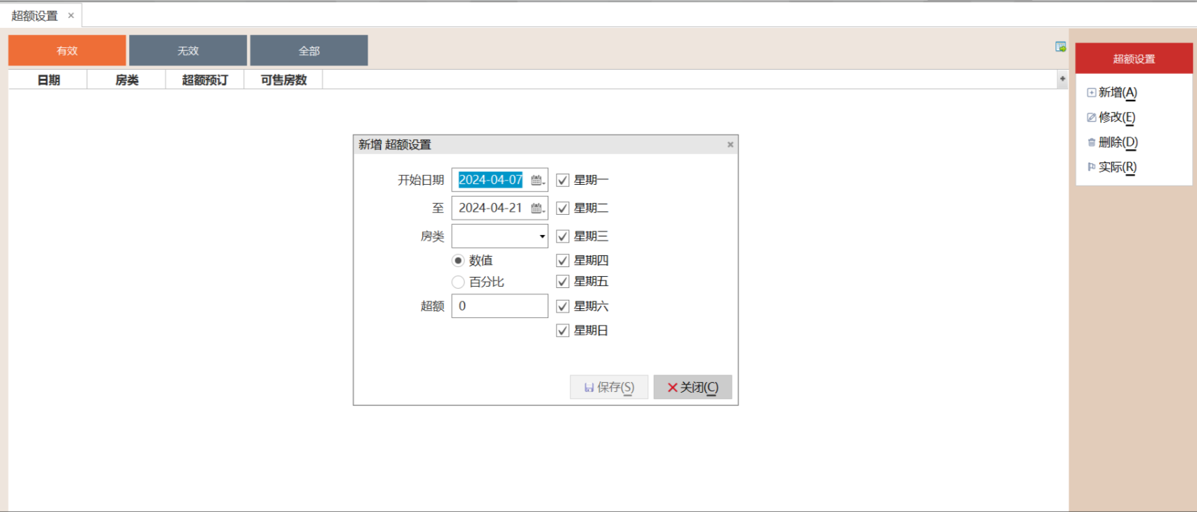 2.1.3 填写超额预订的房类,开始日期和截止日期,数量,点击"保存"