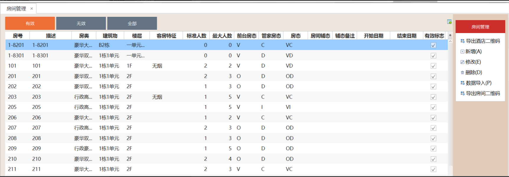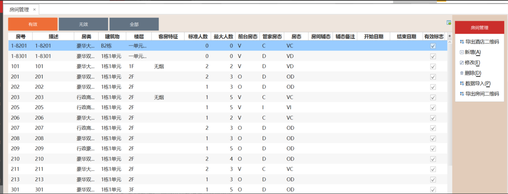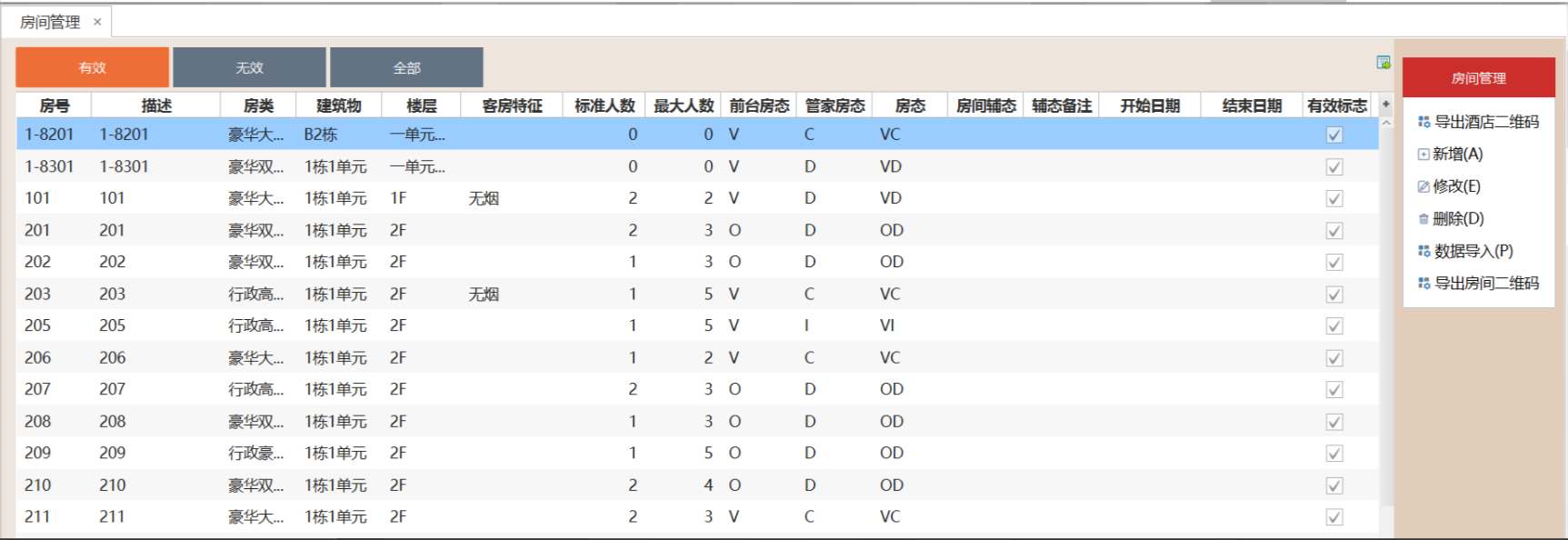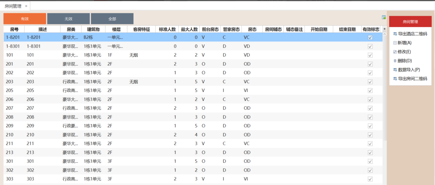 用于定义酒店的房间代码,包括房号、房类、建筑物、楼层、标准人数、最大人数、房态、房间特征等。