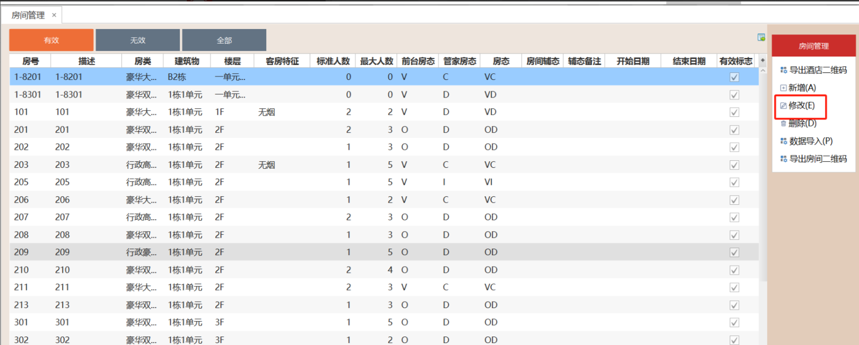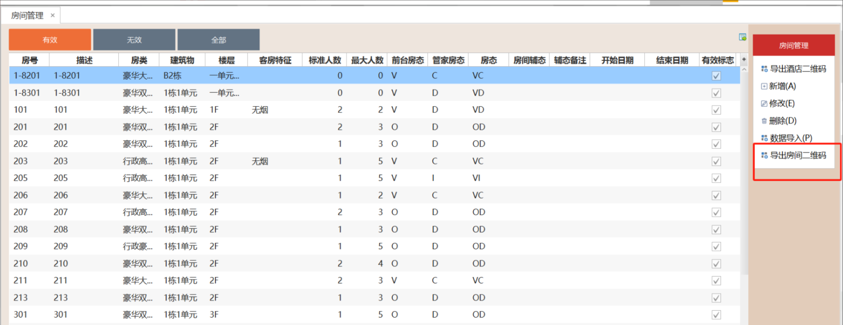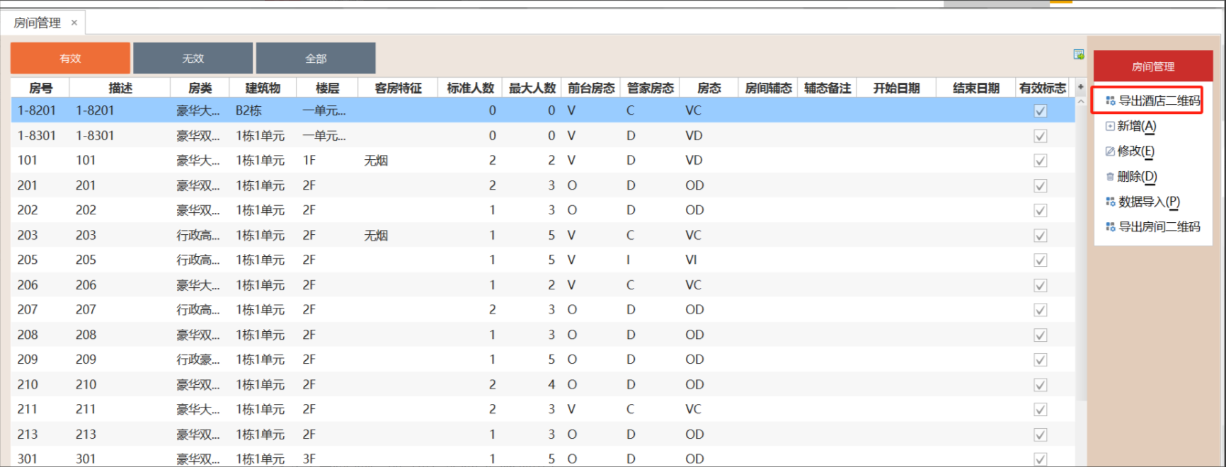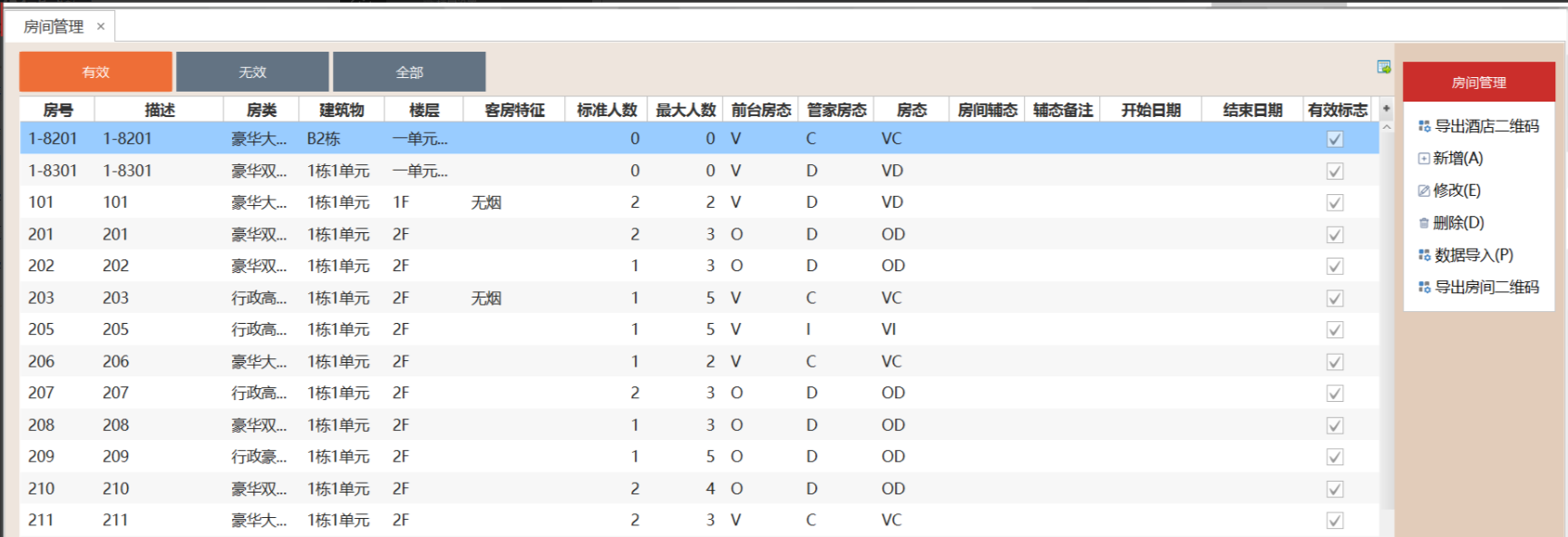 用于定义酒店的房间代码,包括房号、房类、建筑物、楼层、标准人数、最大人数、房态、房间特征等。