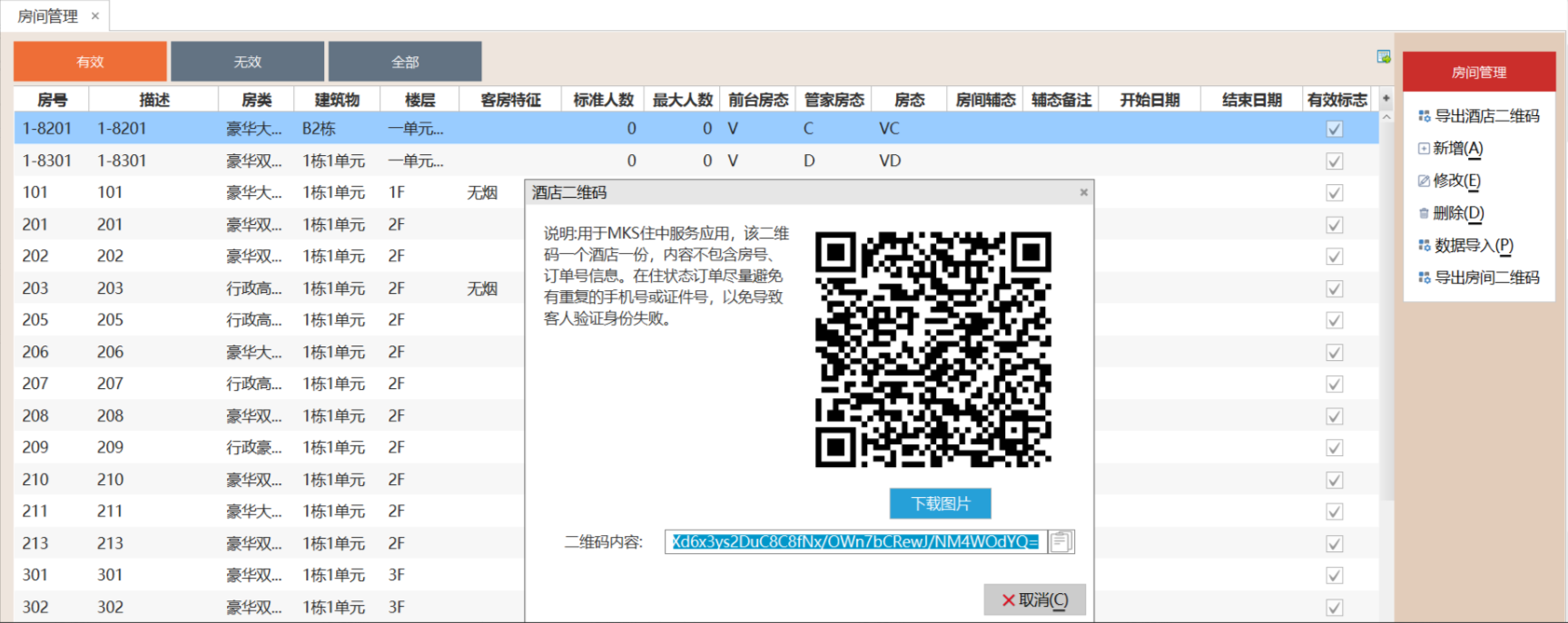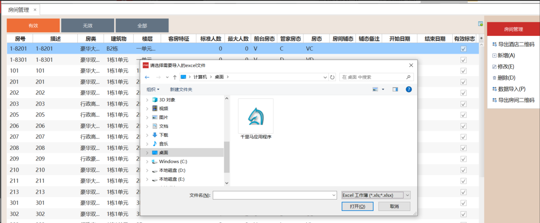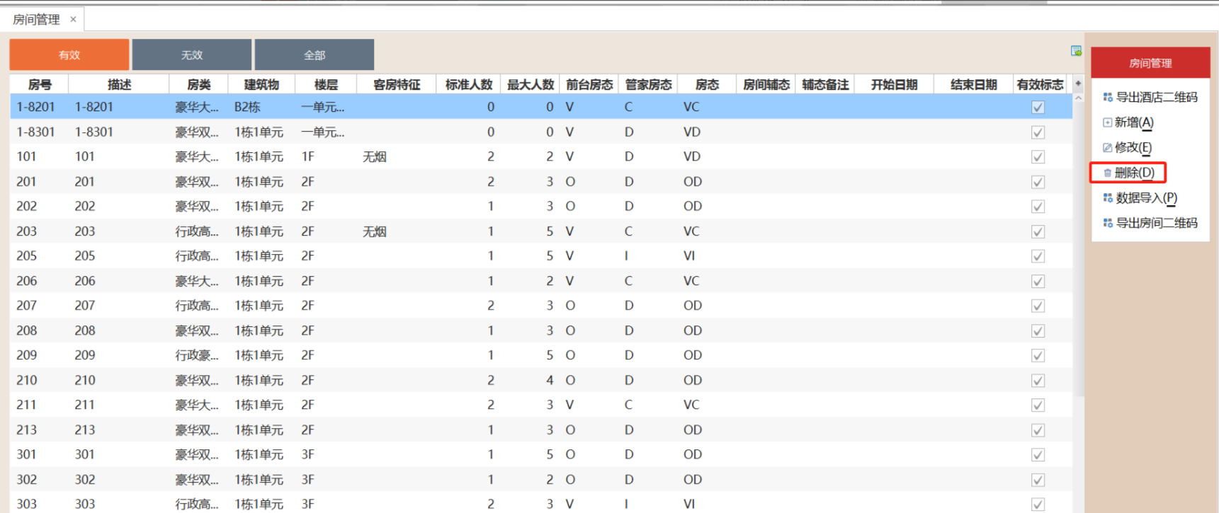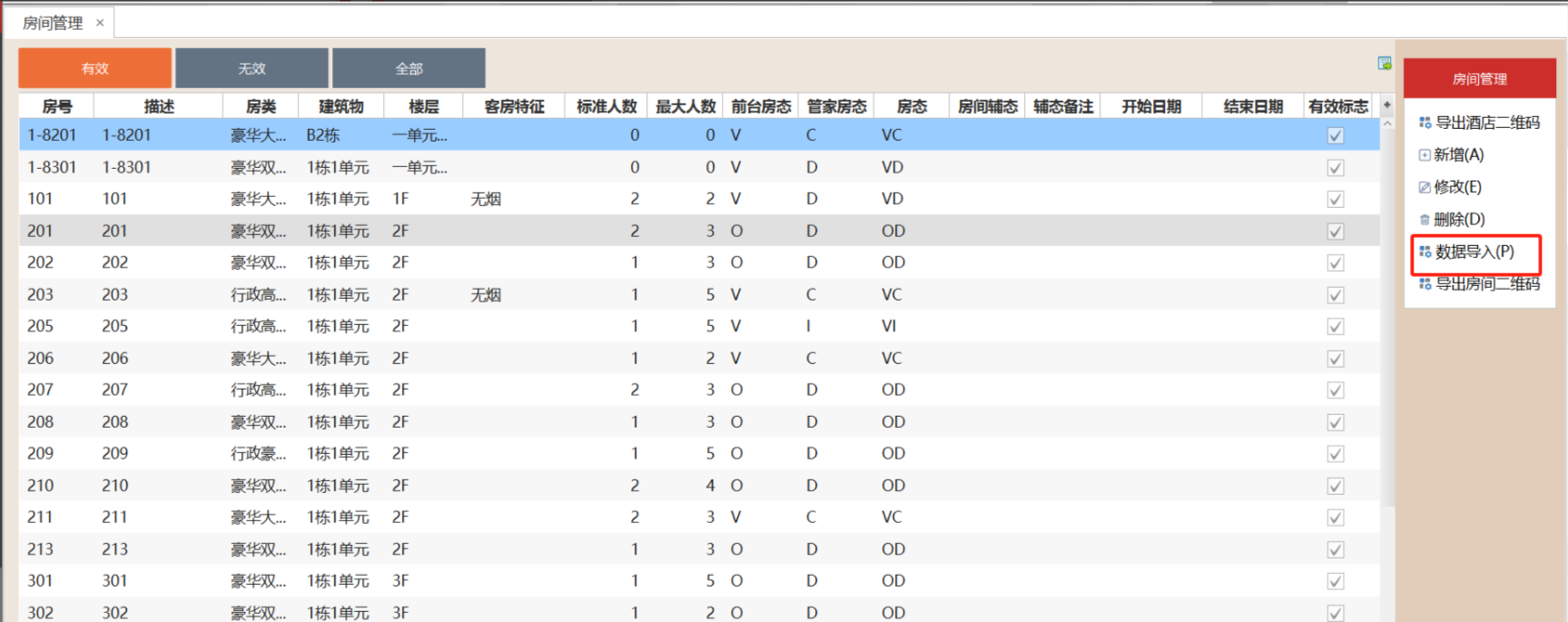 用于定义酒店的房间代码,包括房号、房类、建筑物、楼层、标准人数、最大人数、房态、房间特征等。