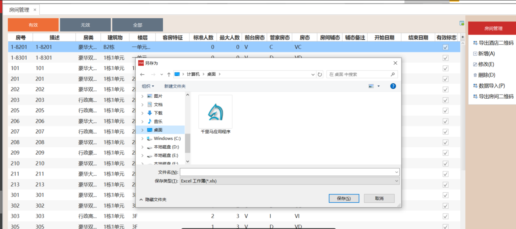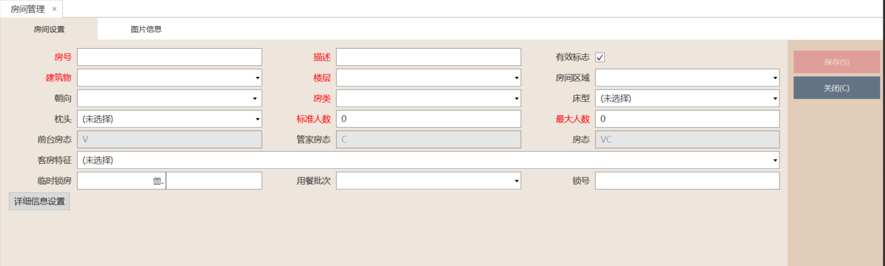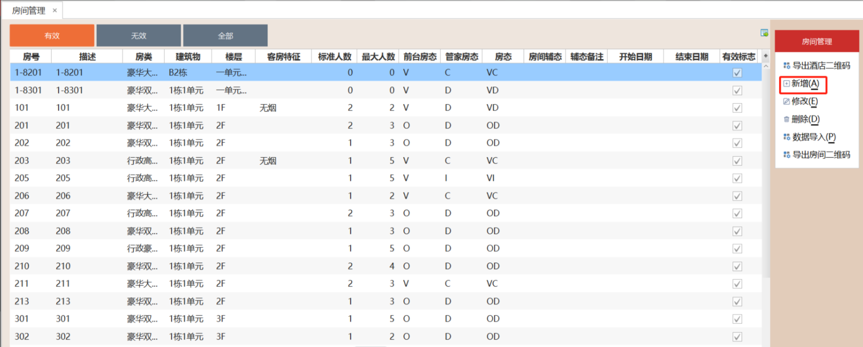 2.1.3 房号、描述、建筑物、标准人数、最大人数、房类为必填项,且房号需取值唯一。提供必要信息,点击保存
