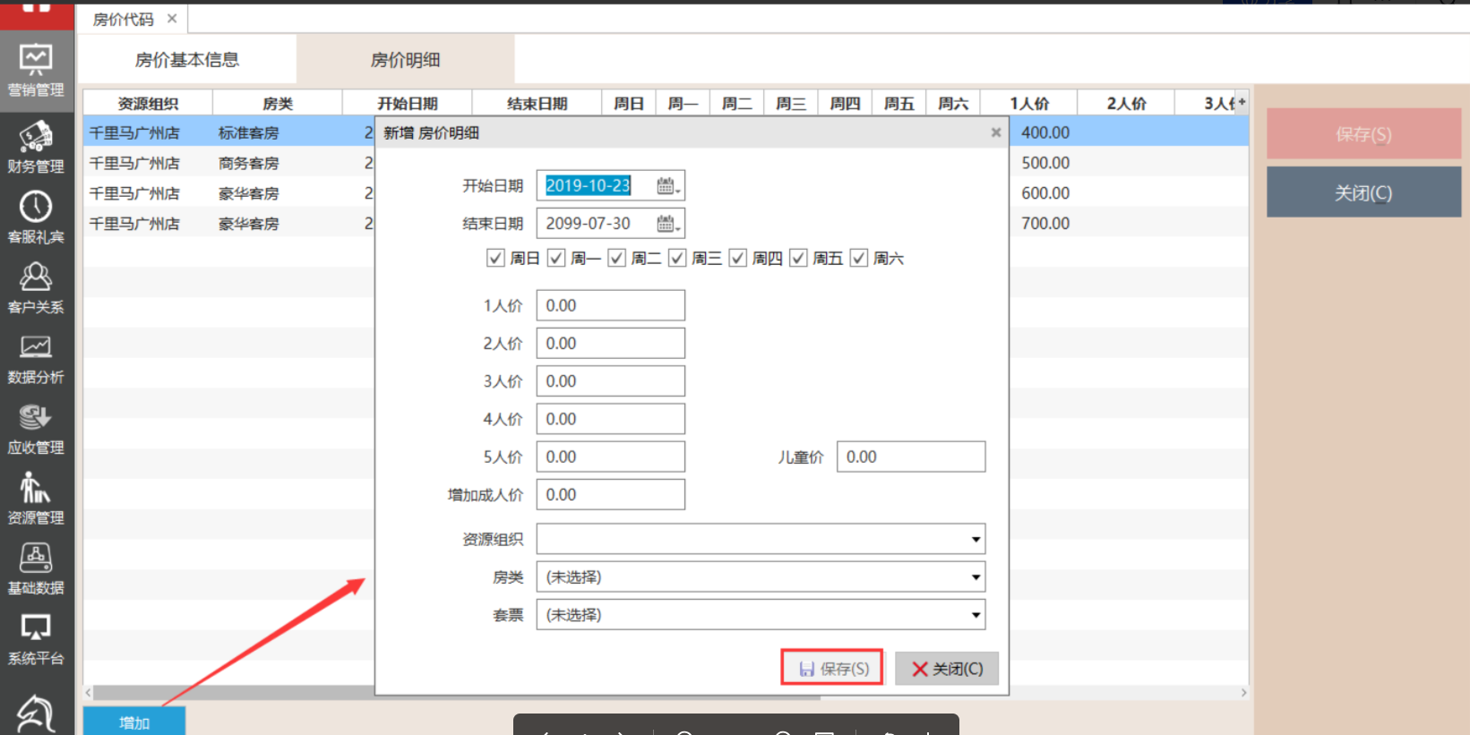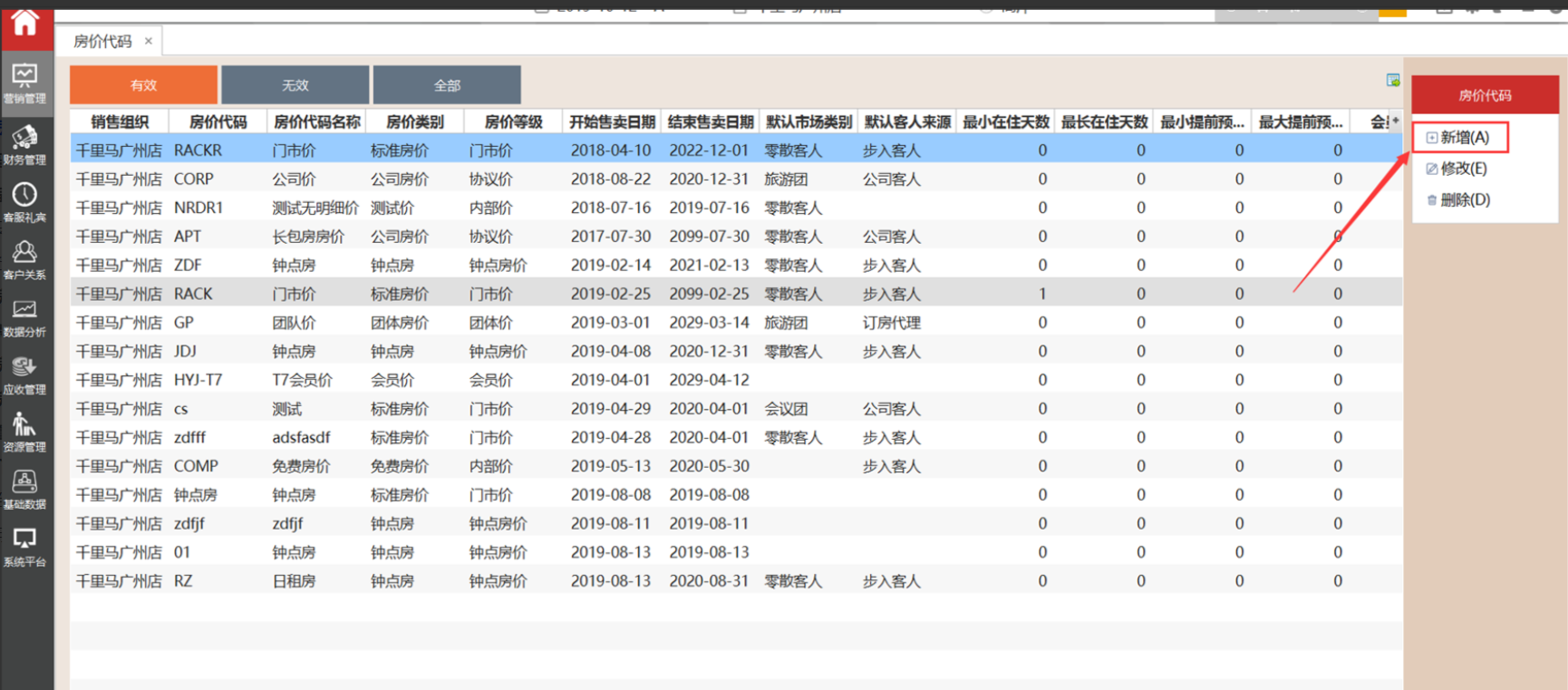 打开房价代码,点击界面右侧的“新增”功能,新增房价。