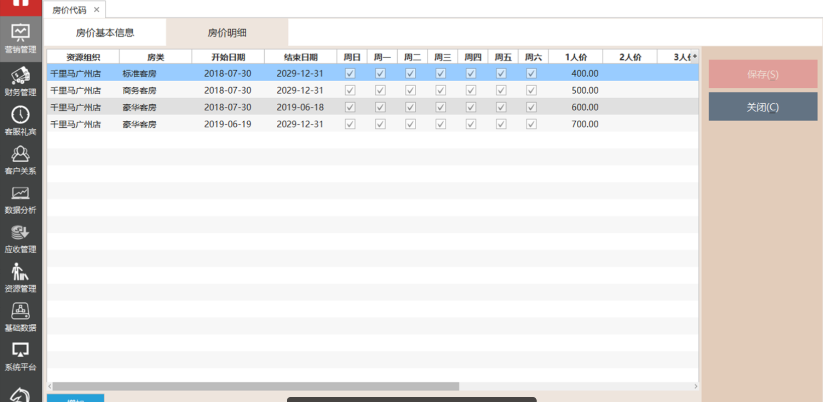 房间类型:用于选择此房价代码适用的房类,将影响哪种房型可使用此房价代码。