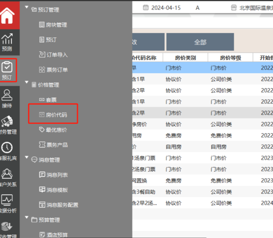 登录IPMS 系统,点击系统左侧的“预定”,选择“价格管理”下面的“房价代码”。