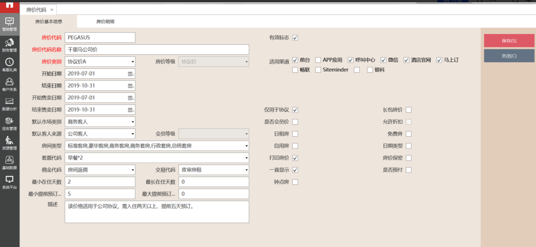 各勾选项目:有效标志、适用渠道、是否协议、是否长包房根据情况选择。