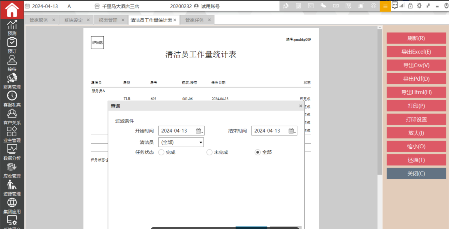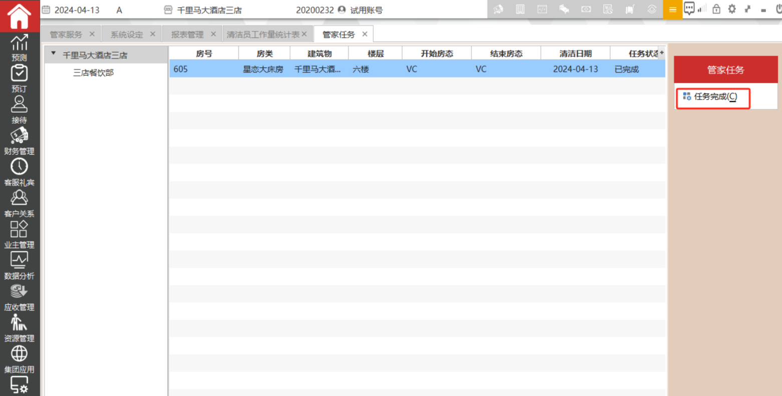 服务员清洁完成后可以电话通知客房文员,客房文员在管家任务中选择对应的房间,点击任务完成,相关数据可以在“清洁员工作量统计表”体现。