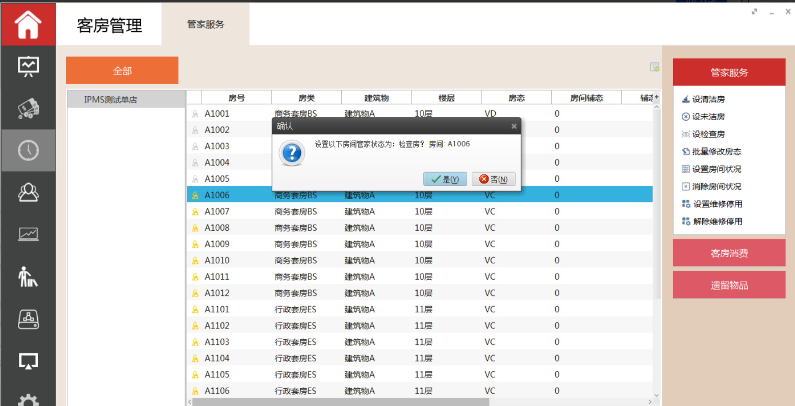 选中需要设置为检查房的房间,执行命令区的设检查房功能,系统弹出是否将选中房间的管家状态设置为检查房,选择是,该客房管家房态转为检查房(I)。
