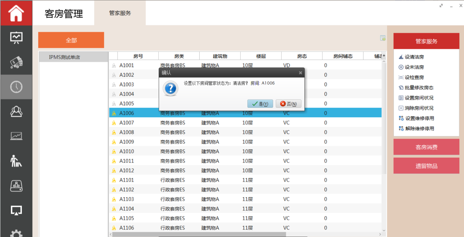 选中需要设置为清洁房的房间,执行命令区的设清洁房功能,系统弹出是否将选中房间的管家状态设置为清洁房,选择是,该客房管家房态转为清洁房(C)。