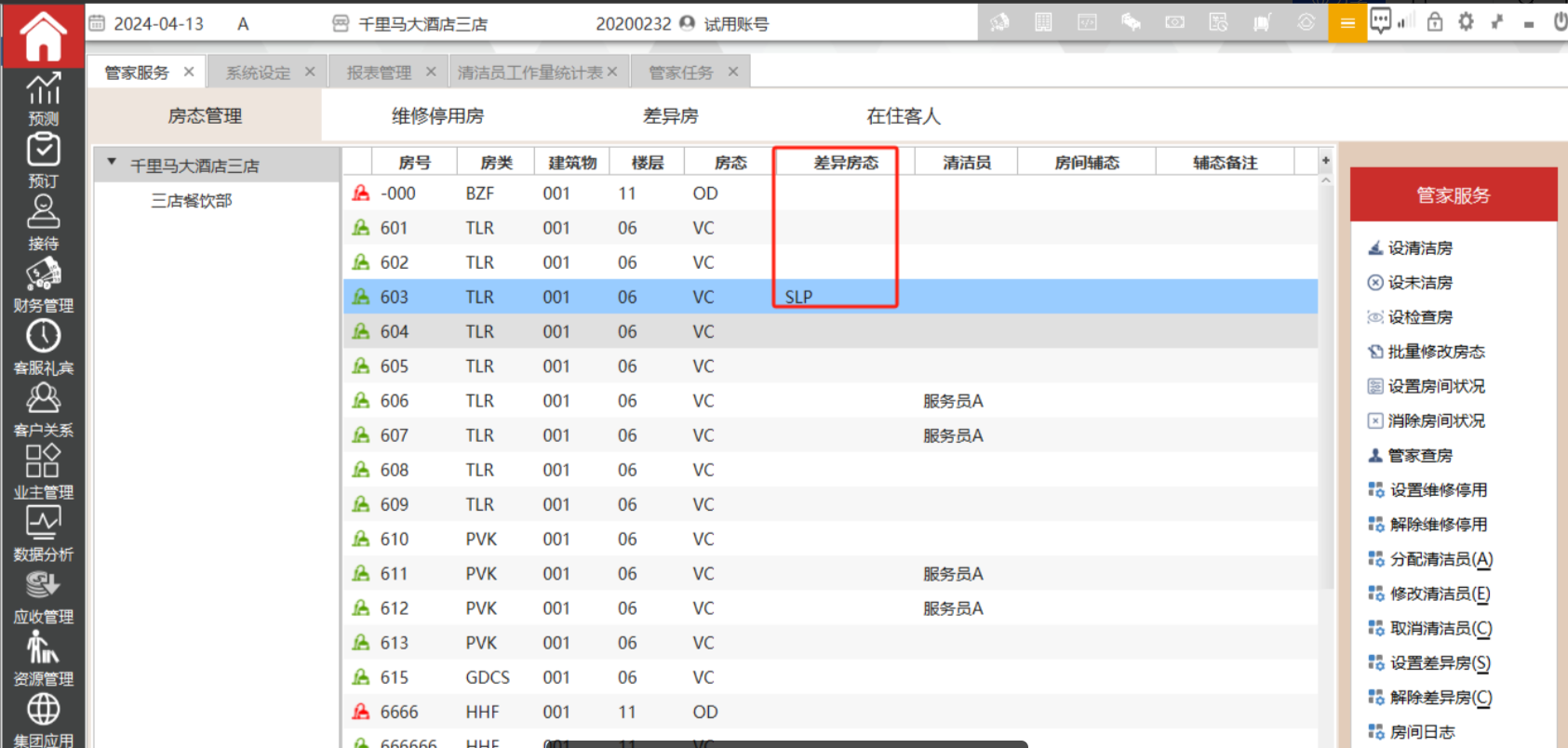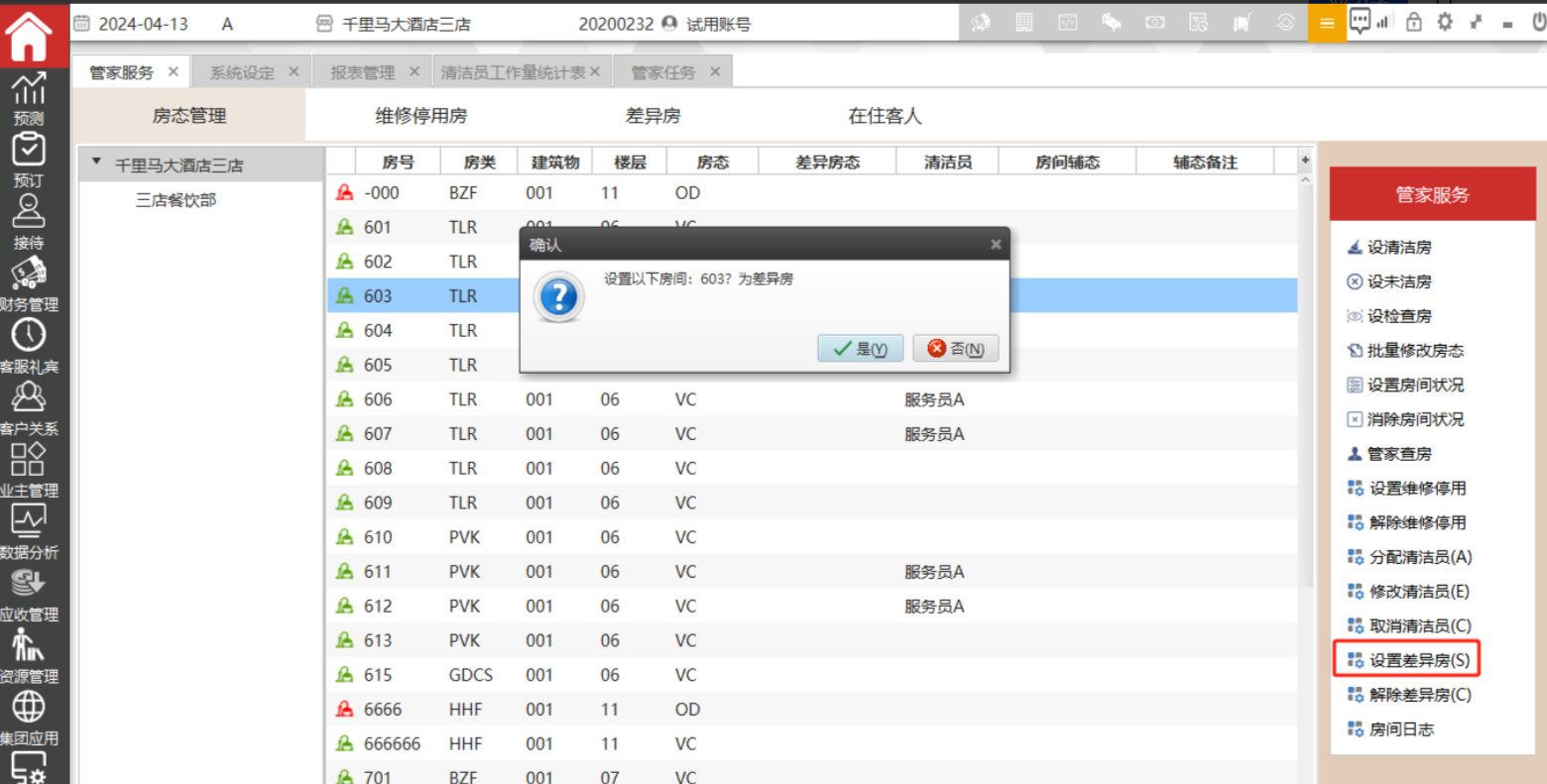 选中需要设置差异房的房间,然后点击“设置差异房”,确定后会在差异房一列显示差异房。该界面支持批量操作,支持按ctrl或shift 多选。