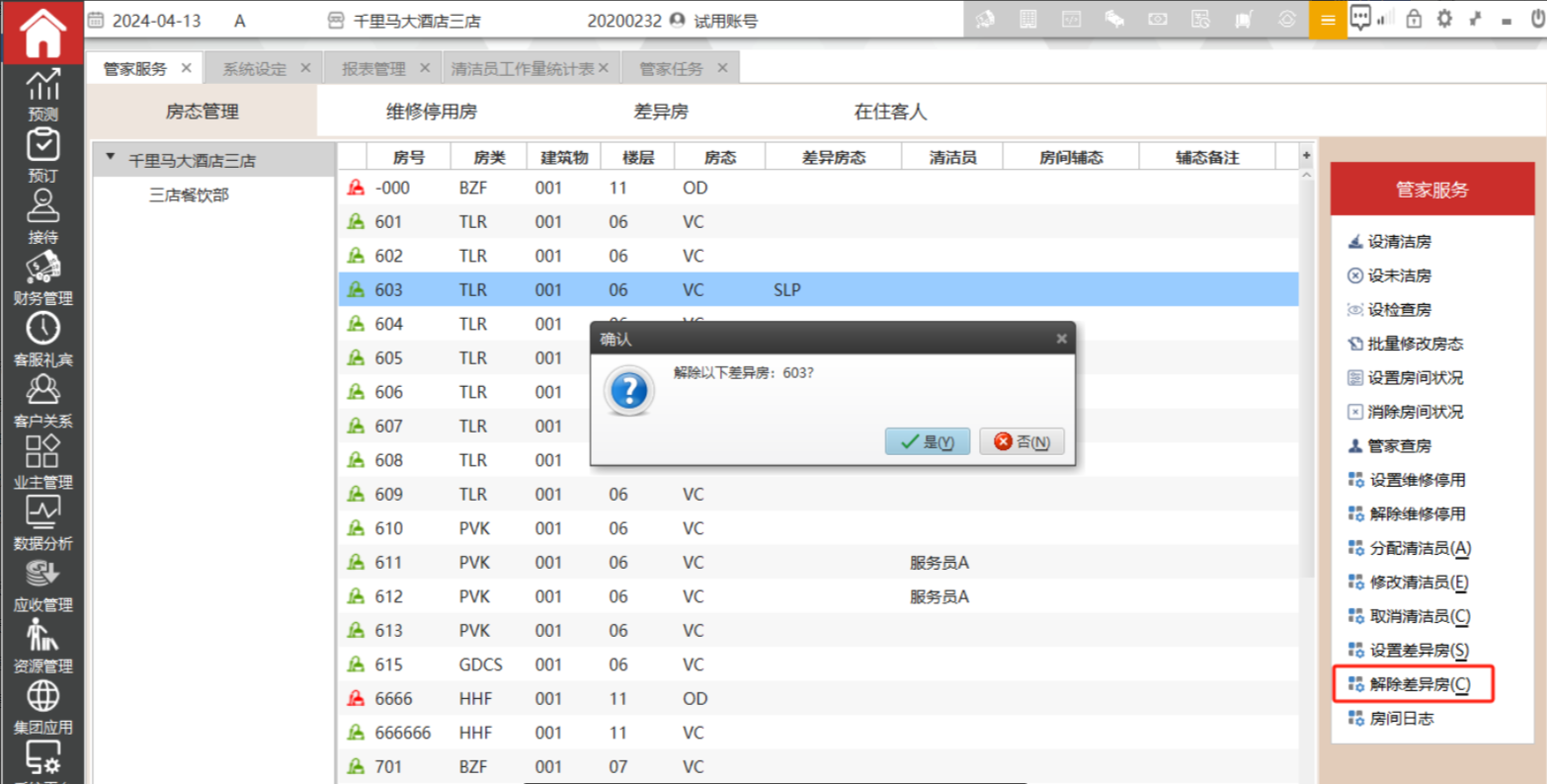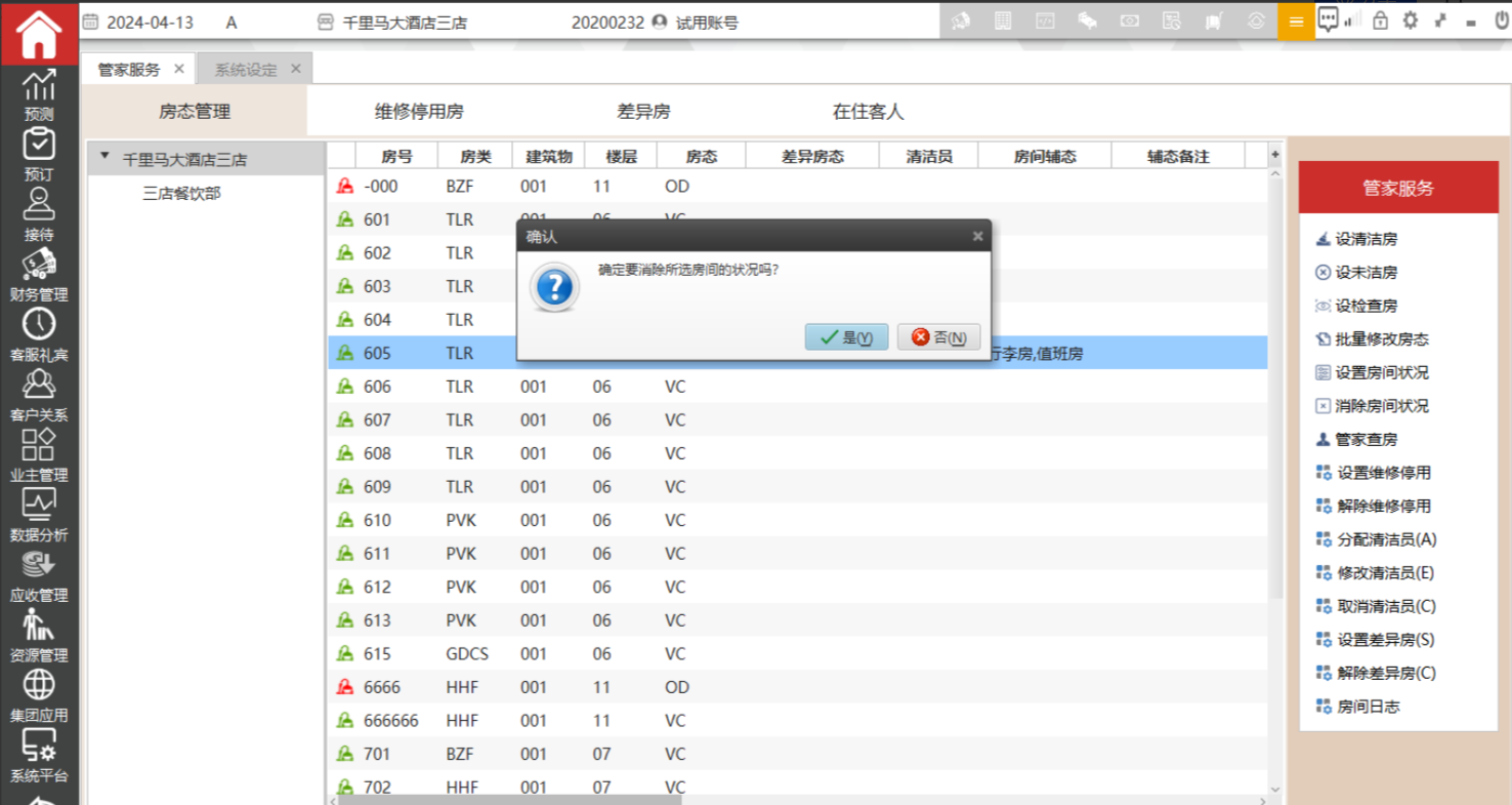 该功能主要是用来解除房间的差异房态.该界面支持批量操作,支持按ctrl或shift 多选。