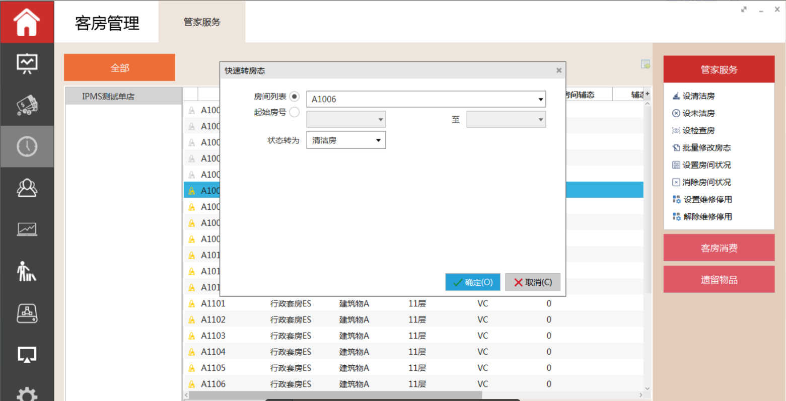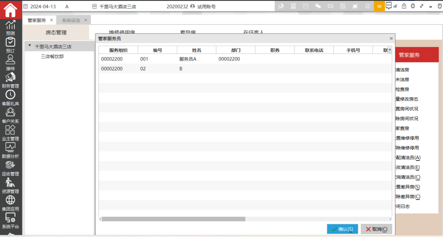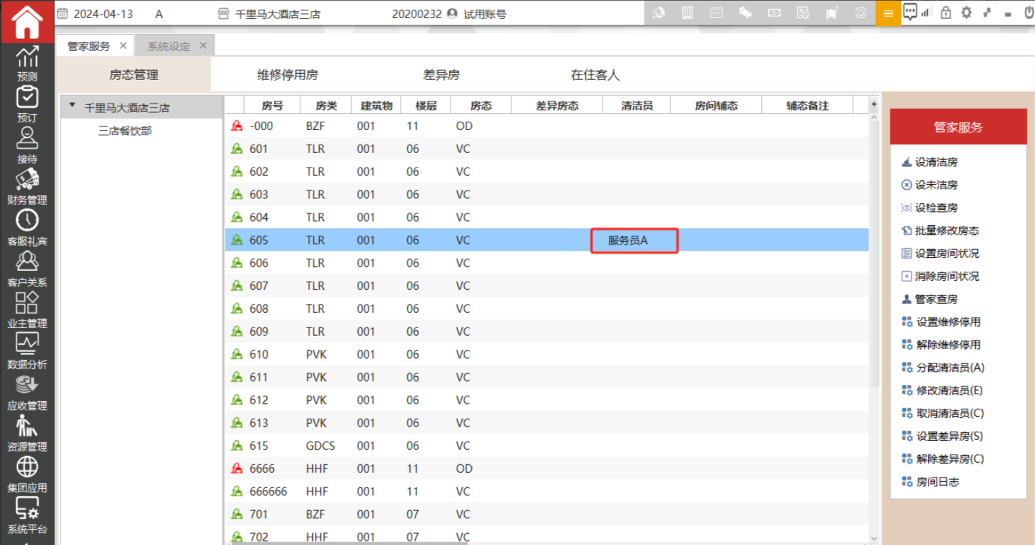 主要是记录房间的清洁员,选中分配给某个清洁员的房间,然后点击分配清洁员,选择对应的服务员,确定后界面上会显示清洁员名字。该界面支持批量操作,支持按ctrl或shift 多选。