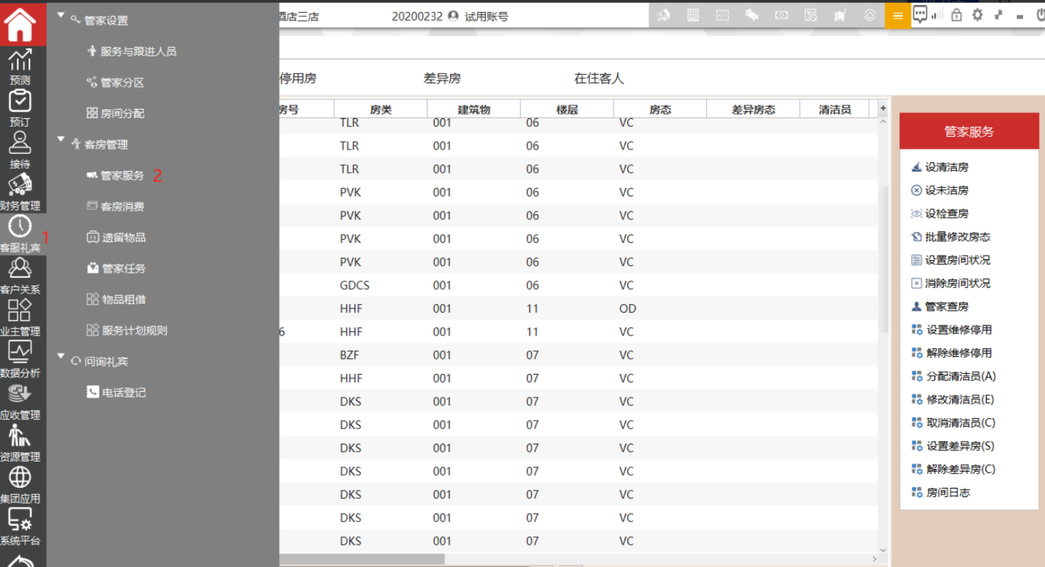 选择主功能菜单【客服礼宾】-》[客房管理]-》管家服务后,即可进入管家服务界面;