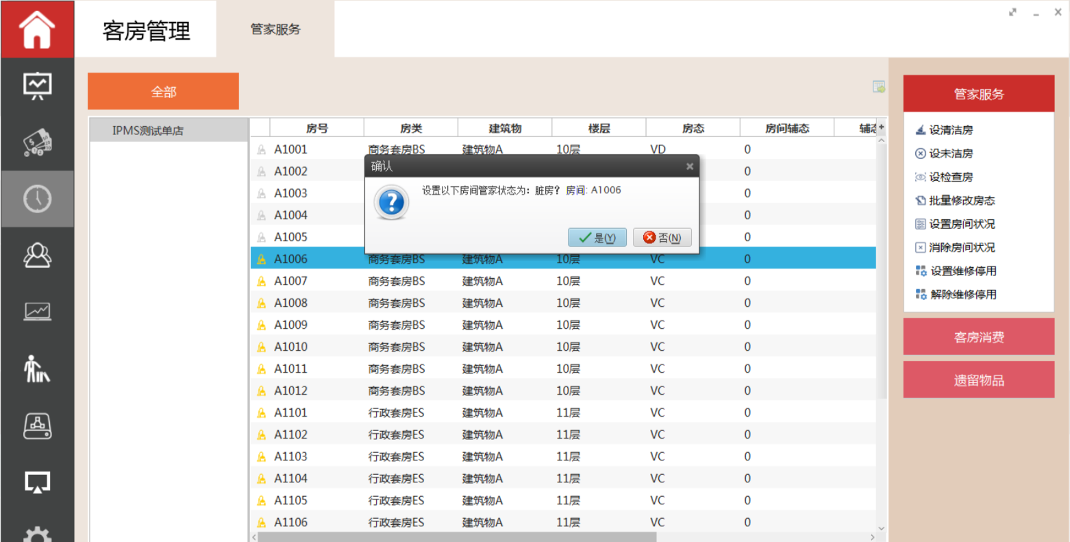 选中需要设置为未洁房的房间,执行命令区的设未洁房功能,系统弹出是否将选中房间的管家状态设置为未洁房,选择是,该客房管家房态转为未洁房(D)。