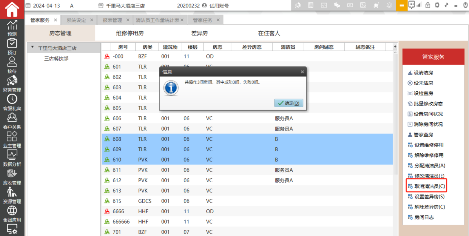 对已经分配清洁员的房间取消分配清洁员,选中需要调整清洁员的房间,然后点击取消清洁员,确定后界面上会去掉清洁人员的名字。该界面支持批量操作,支持按ctrl或shift 多选。