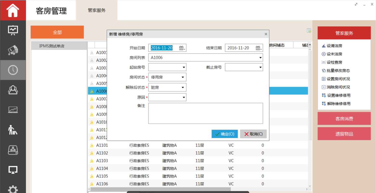 选中需要设置为维修房的房间,执行命令区的设维修房功能,系统弹出设置维修房界面,开始日期默认为当前日期,必须输入维修类别与维修原因,确定退出,对弹出的提示按确定键,该客房管家房态转为维修房。