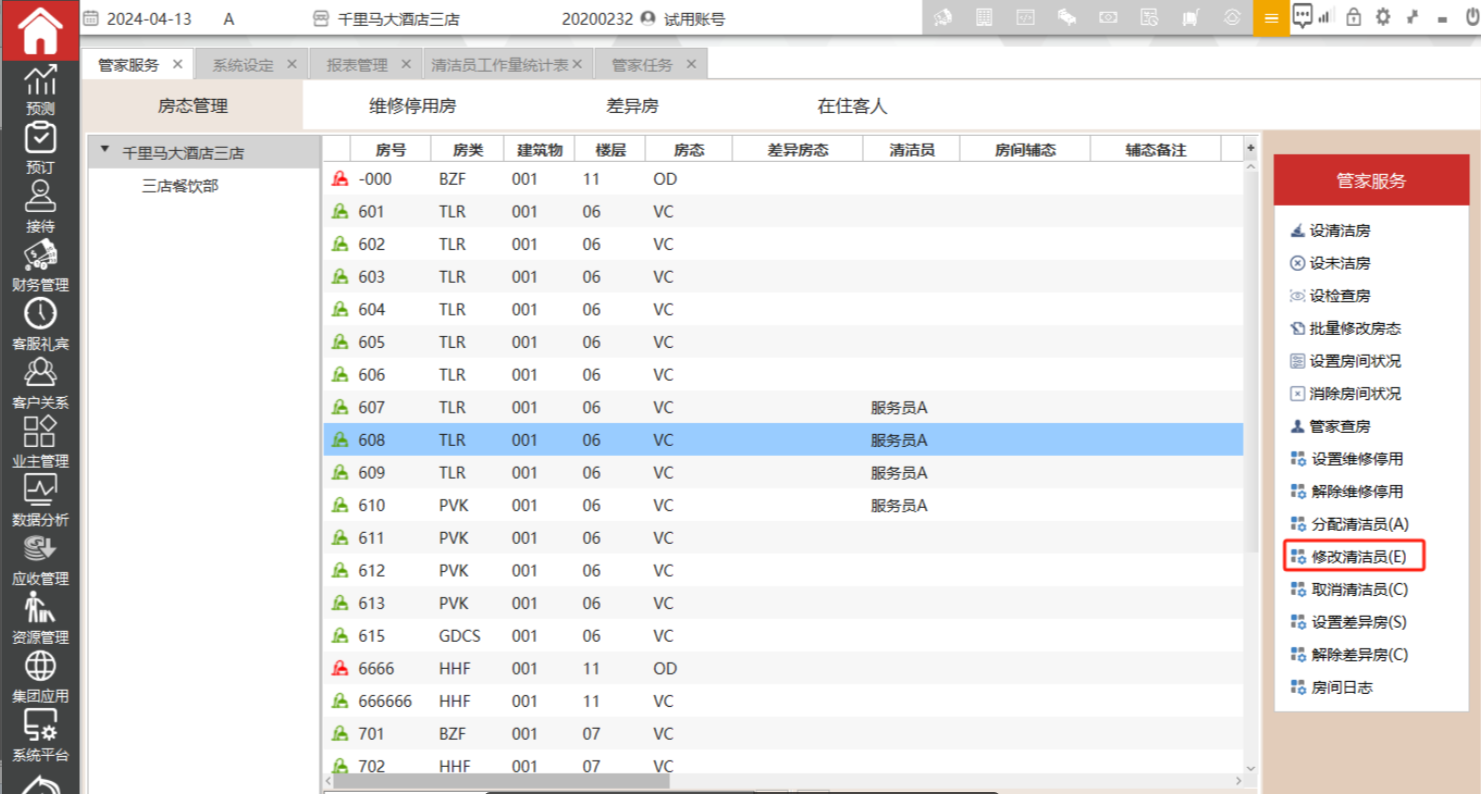 对已经分配清洁员的房间调整清洁员,选中需要调整清洁员的房间,然后点击修改清洁员,选择对应的服务员,确定后界面上会显示调整后的清洁员名字。该界面支持批量操作,支持按ctrl或shift 多选。