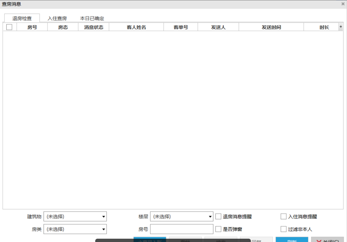 前台对客人的发送退房通知,入住通知。管家进行查房后对前台进行回复查房结果。查房通知界面查询当前一天的通知记录。也可以对选中的房间进行小商品入帐。