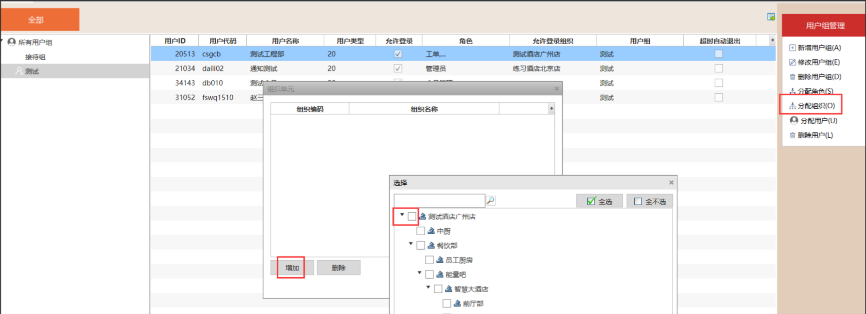 点击“分配组织”,勾选允许该用户组登陆的组织。