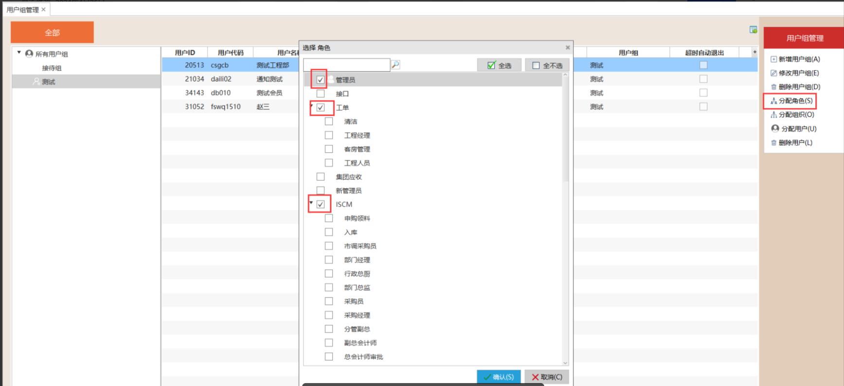 点击“分配角色”,勾选需要的角色可以给该用户组下的所有用户分配角色。