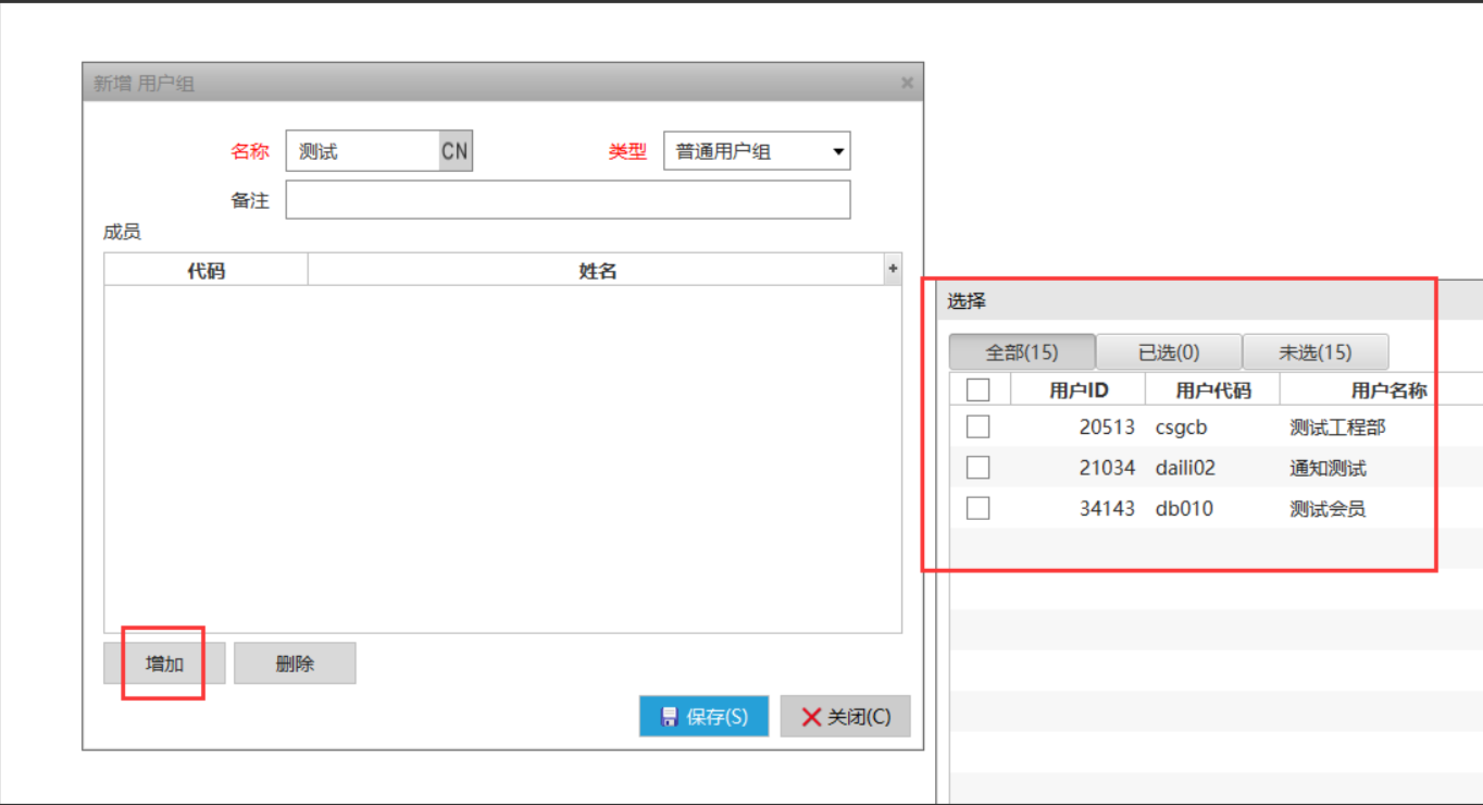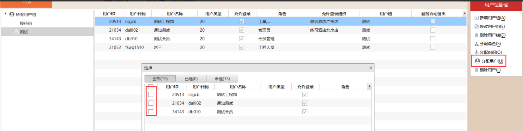 点击“分配用户”,勾选用户添加进该用户组。