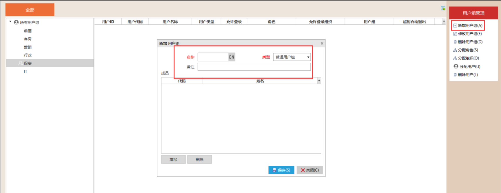 系统平台 -> 用户组管理 -> 新增,输入用户组的“名称”、类型。