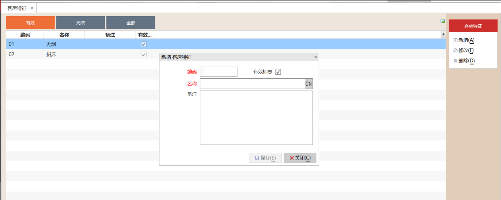 2.1.3 填写"房间特征"的编码、名称,点击"保存"
