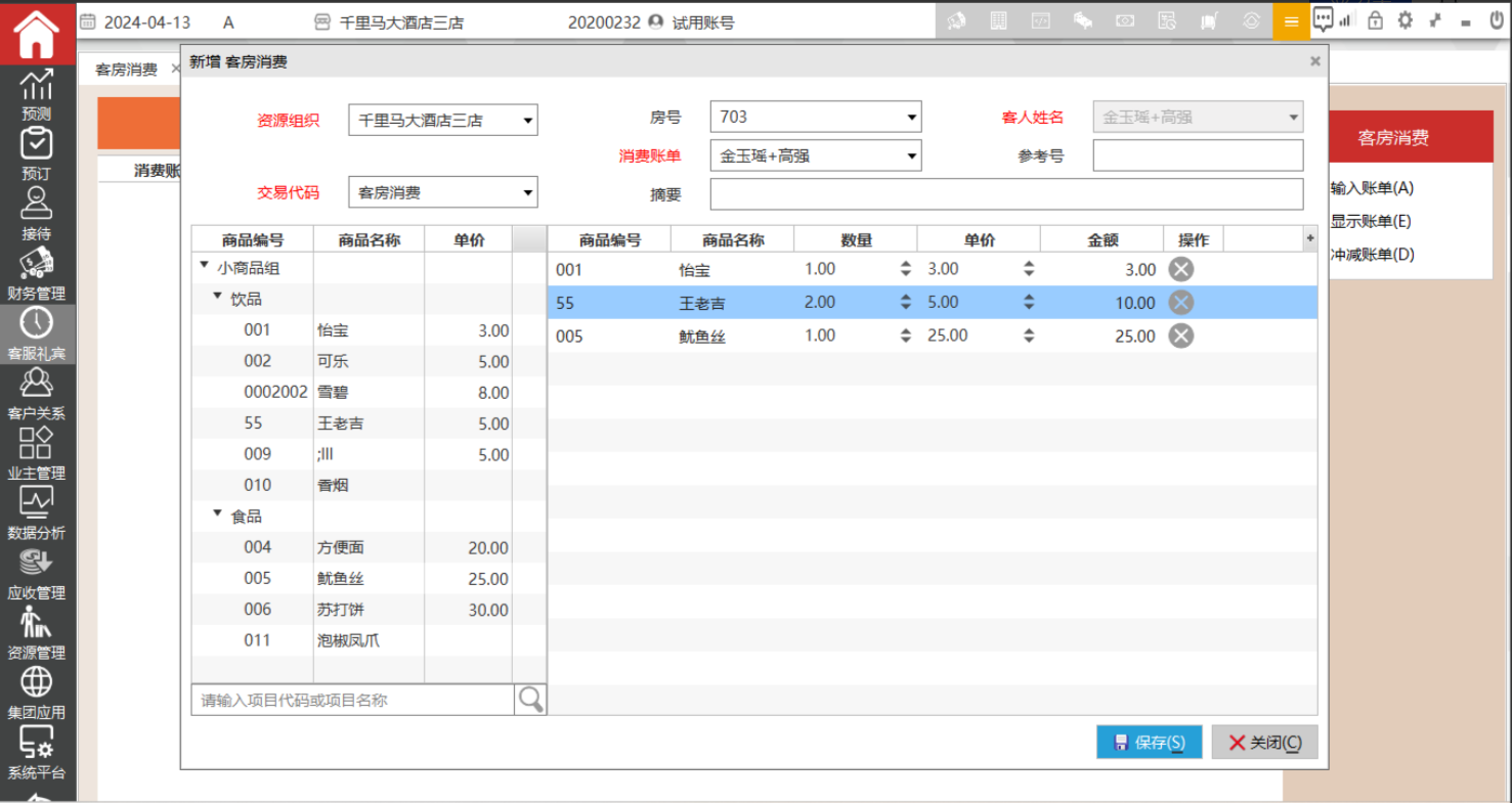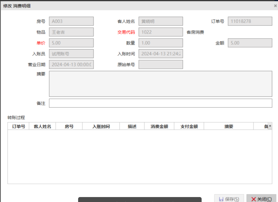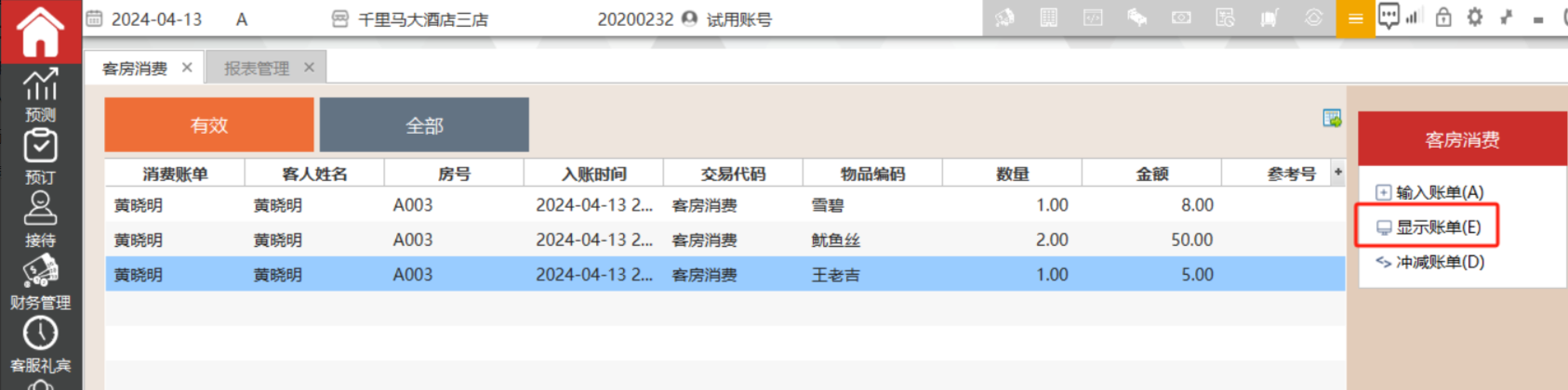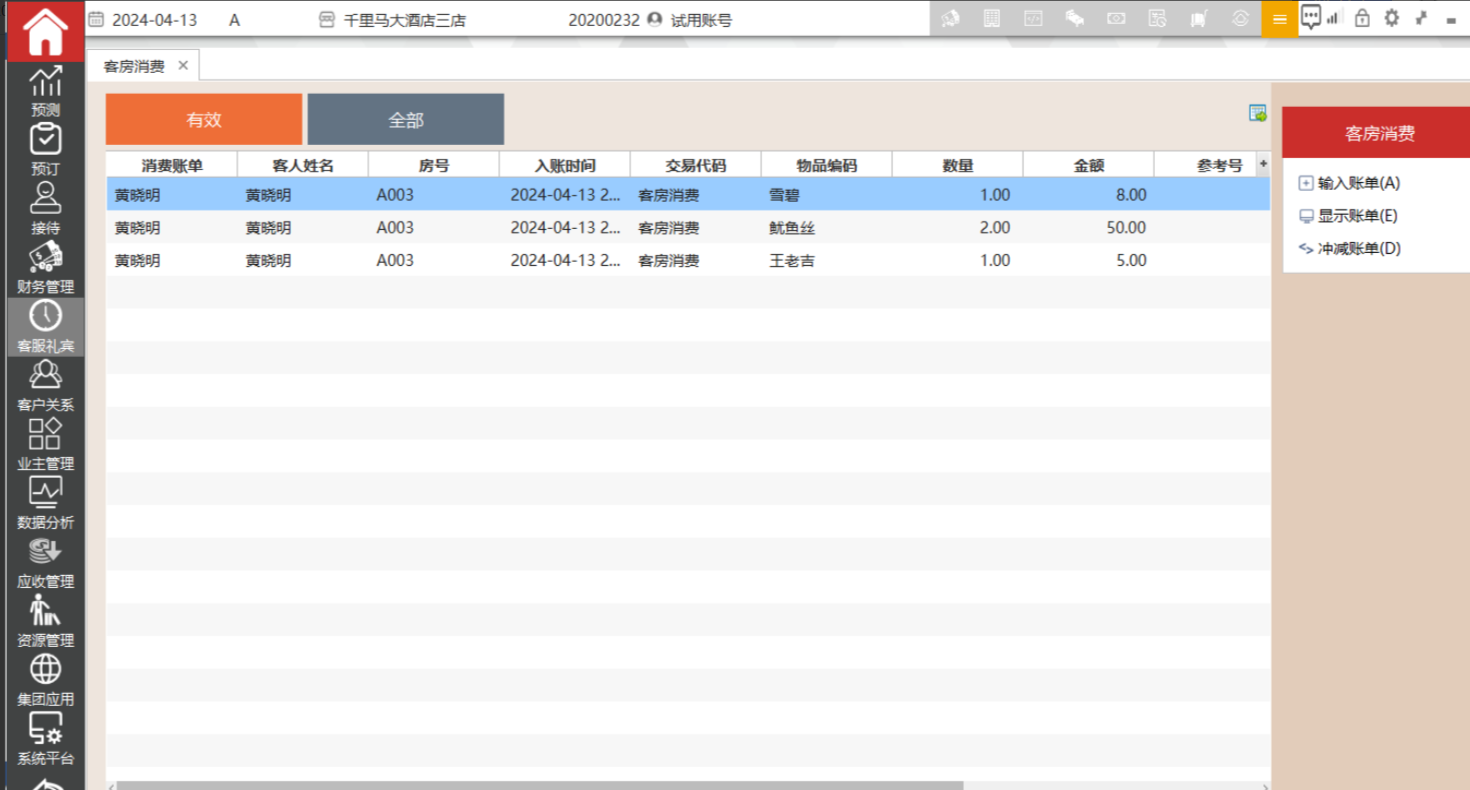 显示客房消费账单的明细内容,且不可更改内容。从客人的账户明细中可以穿透查询管家部录入的账单内容。