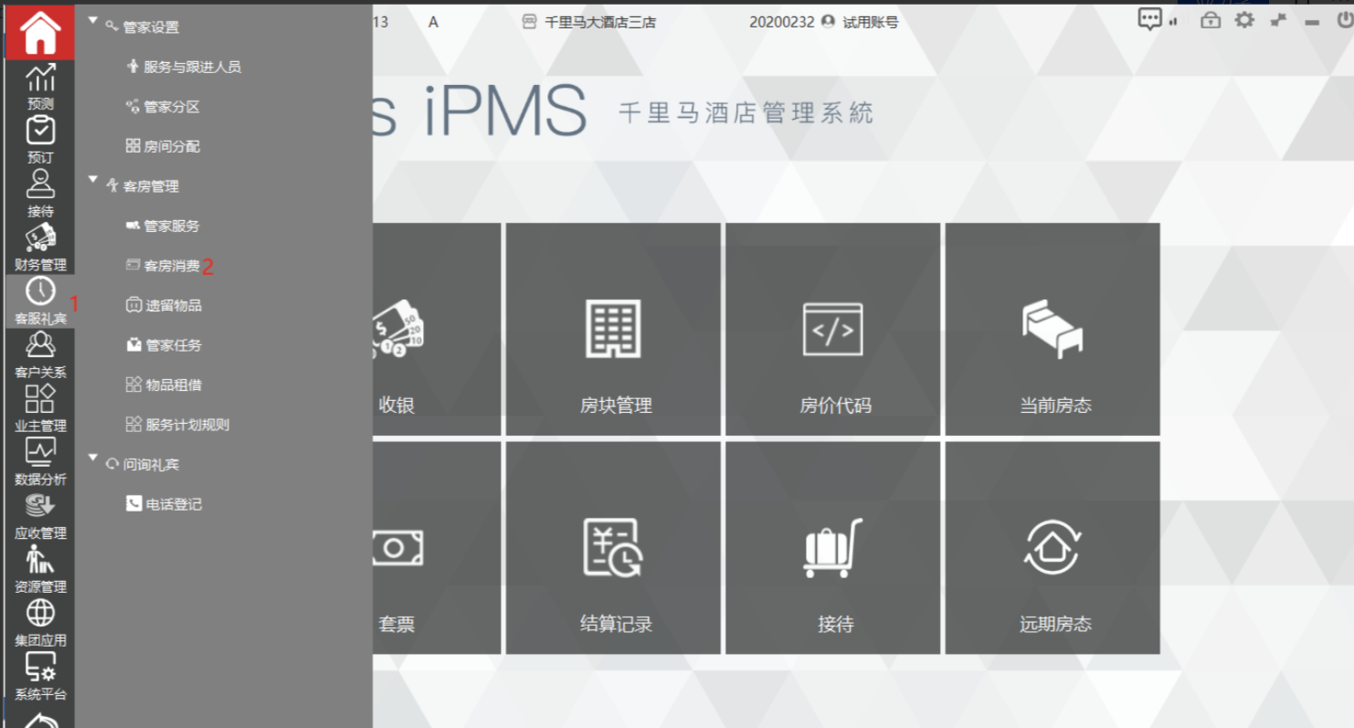 选择主功能菜单【客服礼宾】-》[客房管理]-》客房消费后,即可进入客房消费界面;
