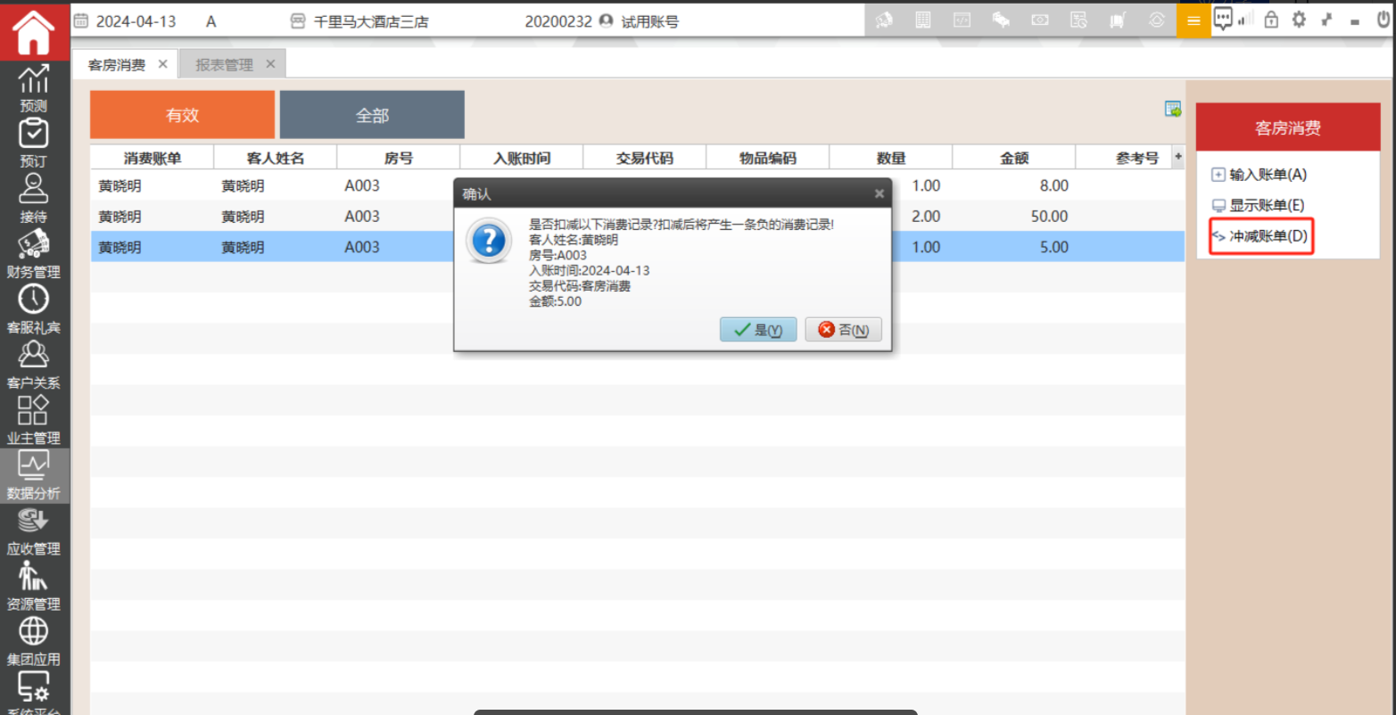 以一正一负来抵消错误的账目,并记录冲减痕迹。选中待冲减的一张或多张客房消费账单,执行命令区冲减账单功能,对弹出的提示确认即可。