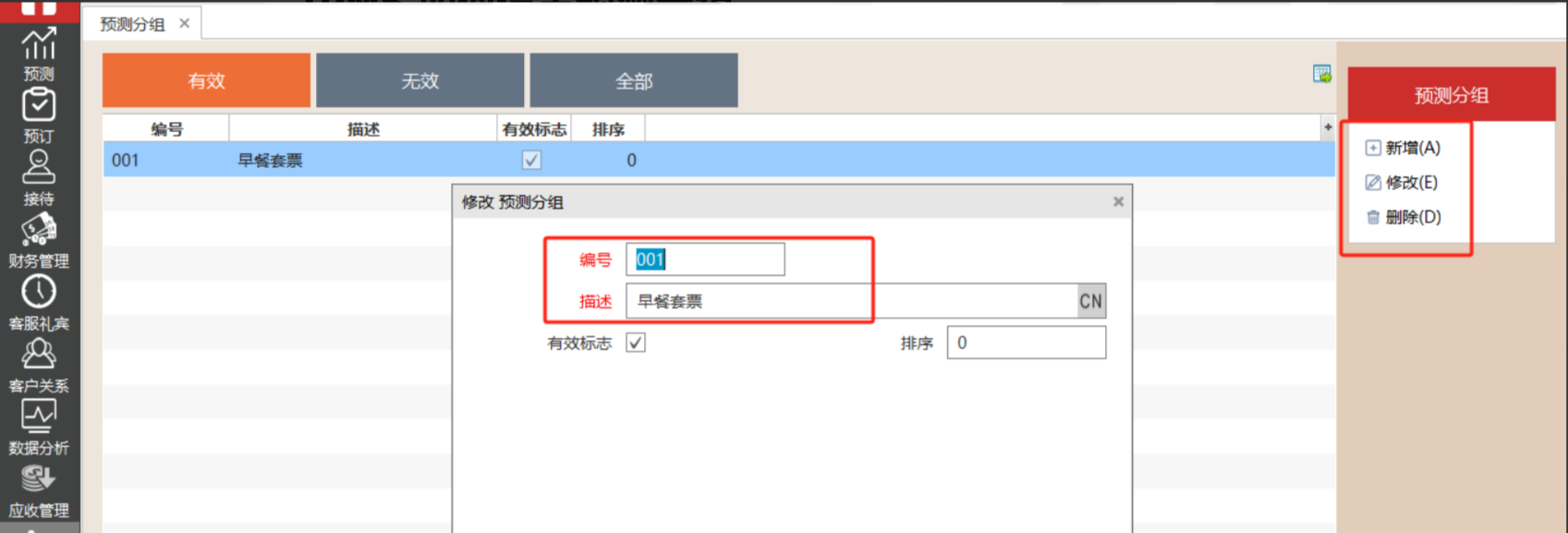 2.进入预测分组页面后右边有、增加、修改、删除功能。