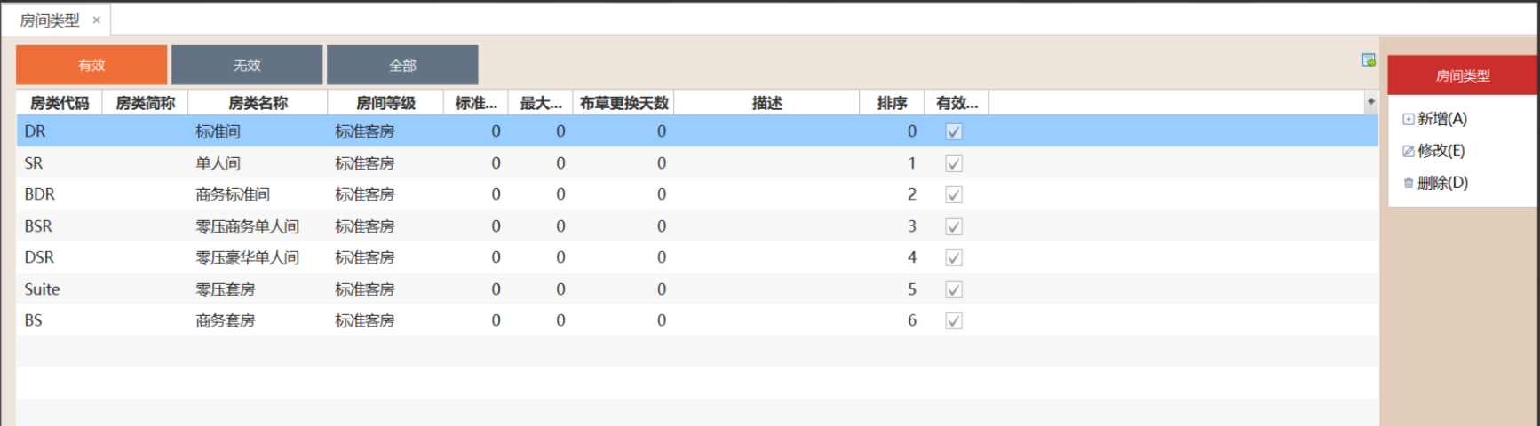 选择[资源管理]-[资源类代码]-[房间类型]主功能菜单后,即可进入房间服务主界面: