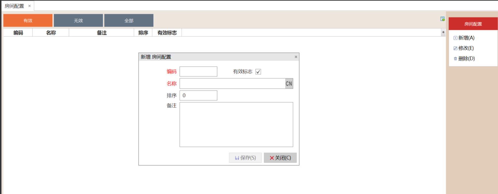 房间配置的主要功能包括:新增、修改、删除。