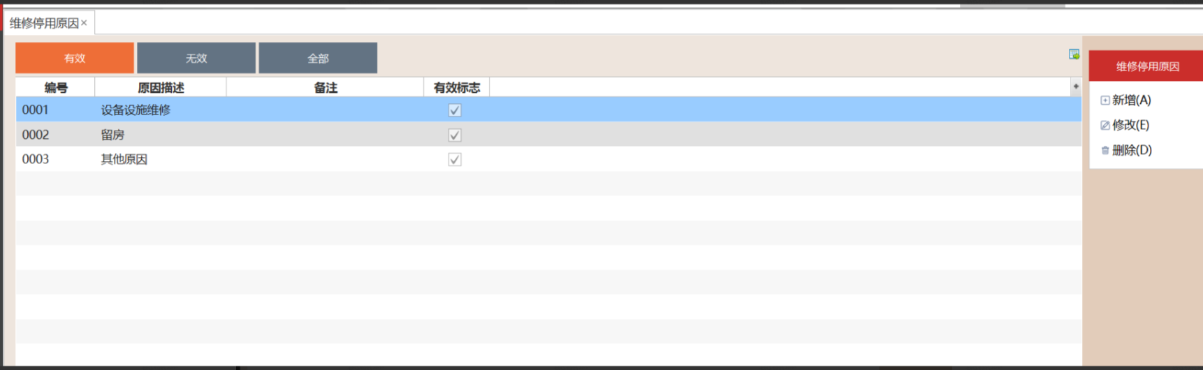 选择[资源管理]-[资源类代码]-[维修停用原因]主功能菜单后,即可进入维修停用原因主界面: