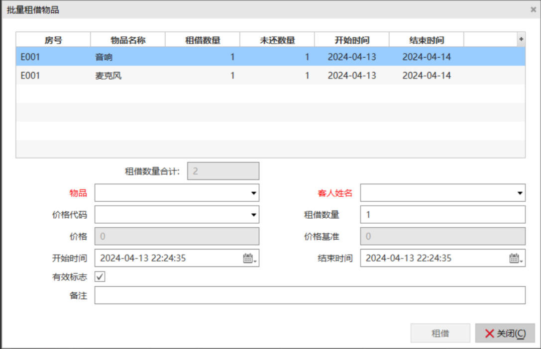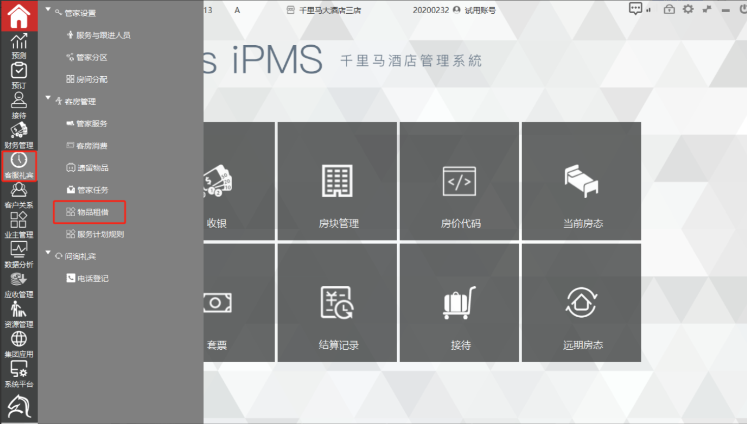 选择主功能菜单【客服礼宾】-》[客房管理]-》物品租借后,即可进入物品租借界面;