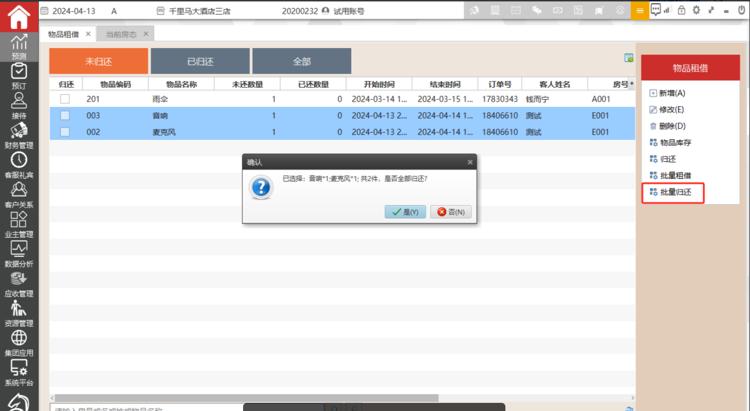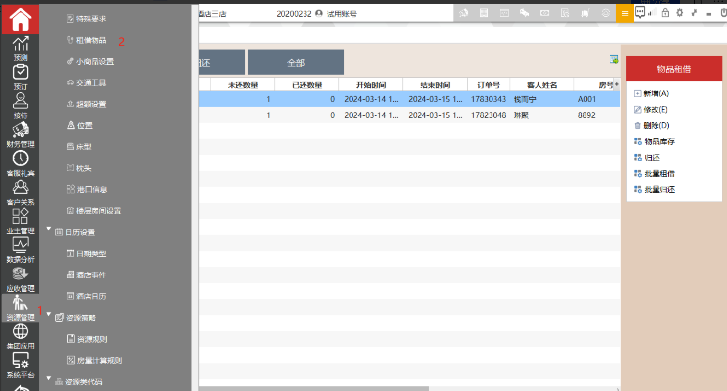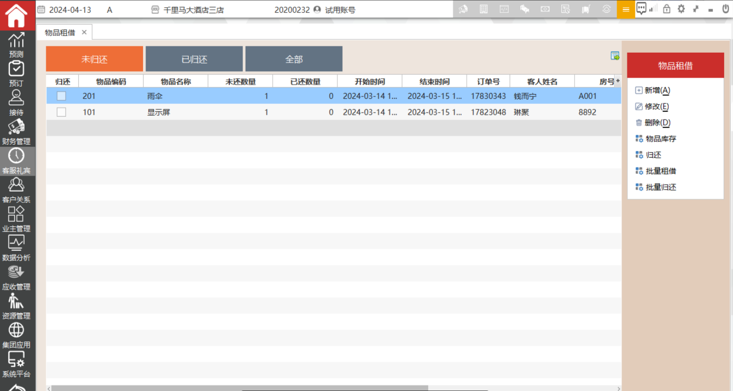 在客房管理中的租借物品中登记租借情况.在未归还中可以查看已经借出的物品,在已归还中可以查看已经归还的物品,全部中可以查看全部租借情况。
